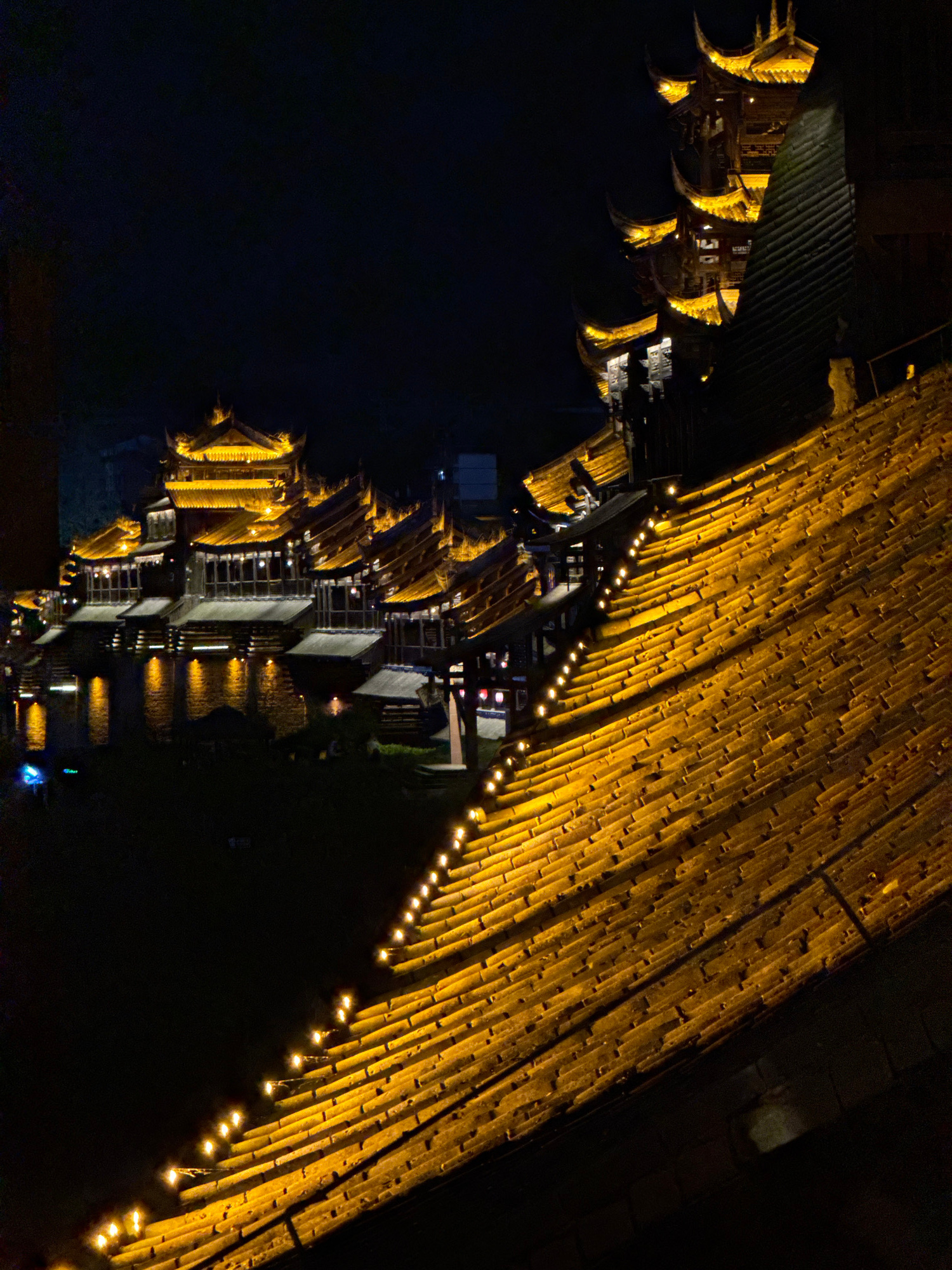 The image shows illuminated buildings at night in Zhuoshui, China. A large bamboo structure with strung lights is positioned at the top right. Multiple buildings are visible along a dark body of water…read more