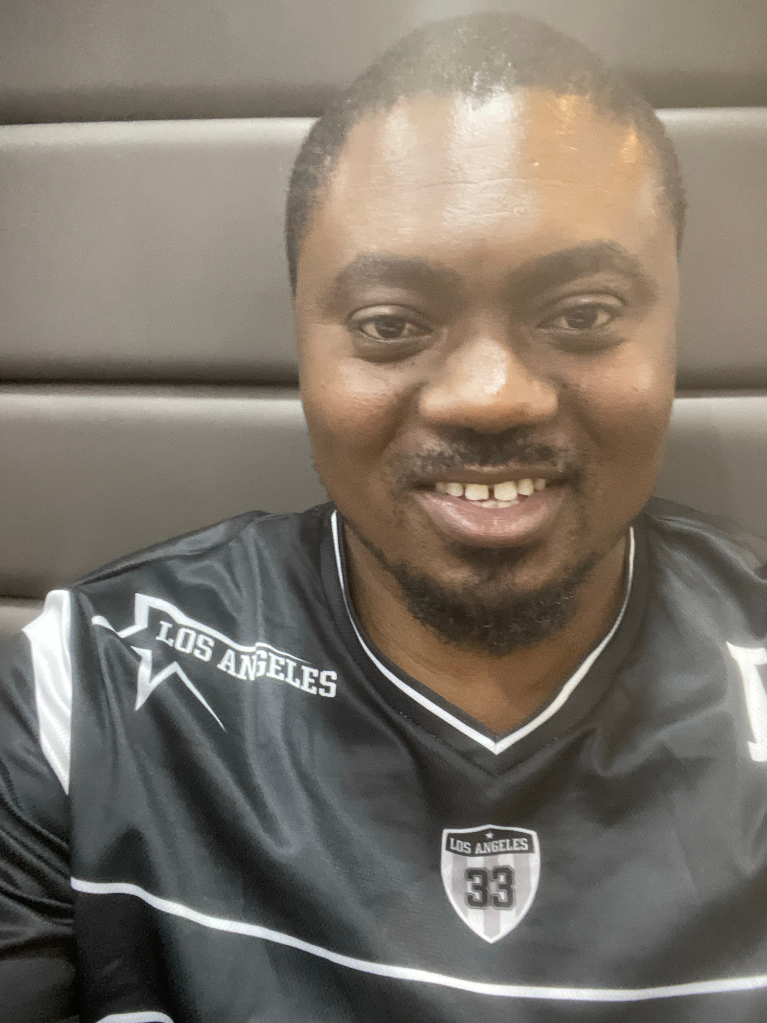 A man with dark skin, wearing a black and white jersey with "Los Angeles" printed on the front and the number 33 on the chest, smiles directly at the camera. He has a trimmed beard and a shaved head w…read more
