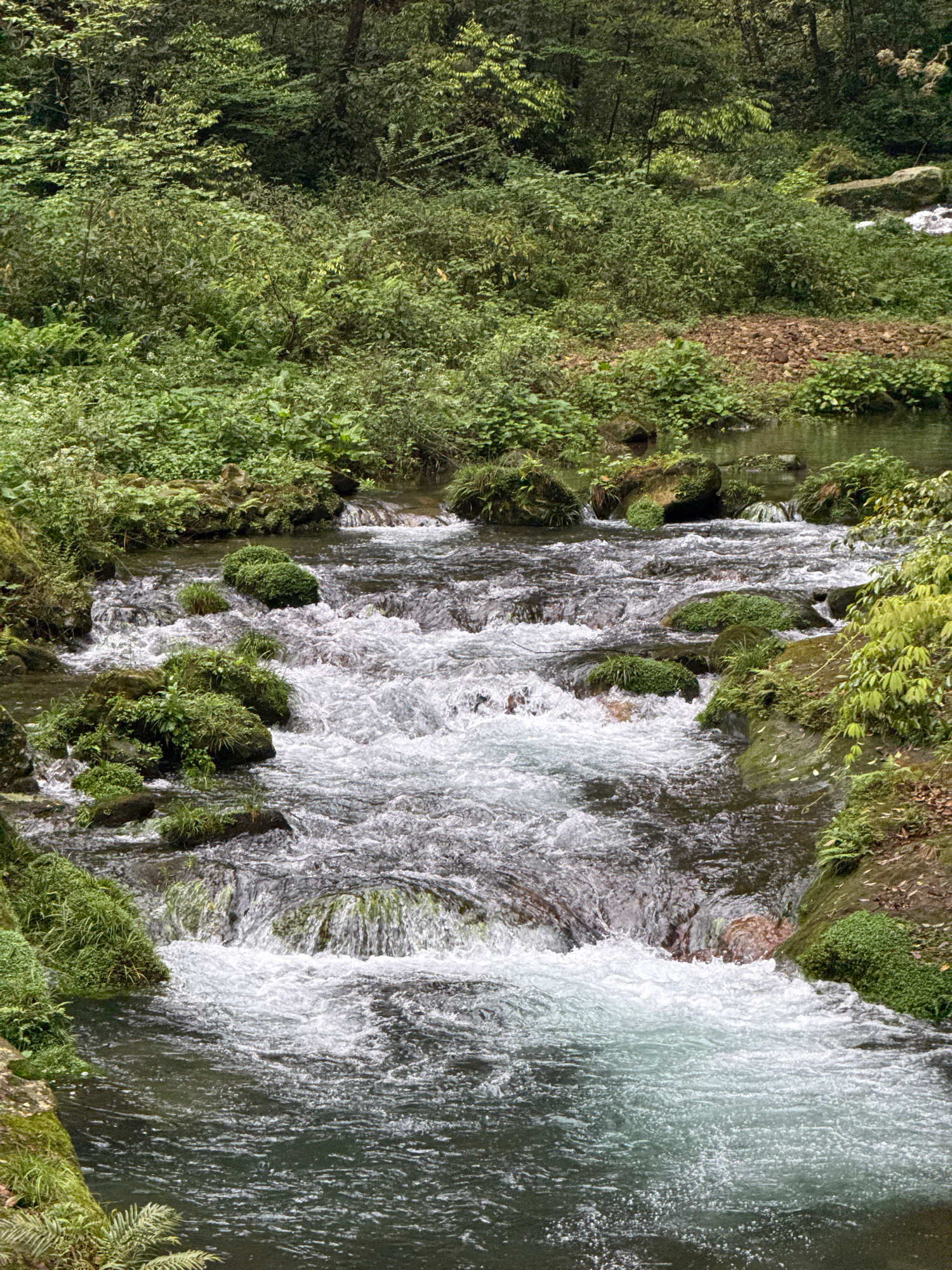 The image shows a waterfall cascading down a rocky slope. Lush green vegetation lines the banks of the stream, creating a vibrant contrast with the white, rushing water. The location is Luoguta, China…read more