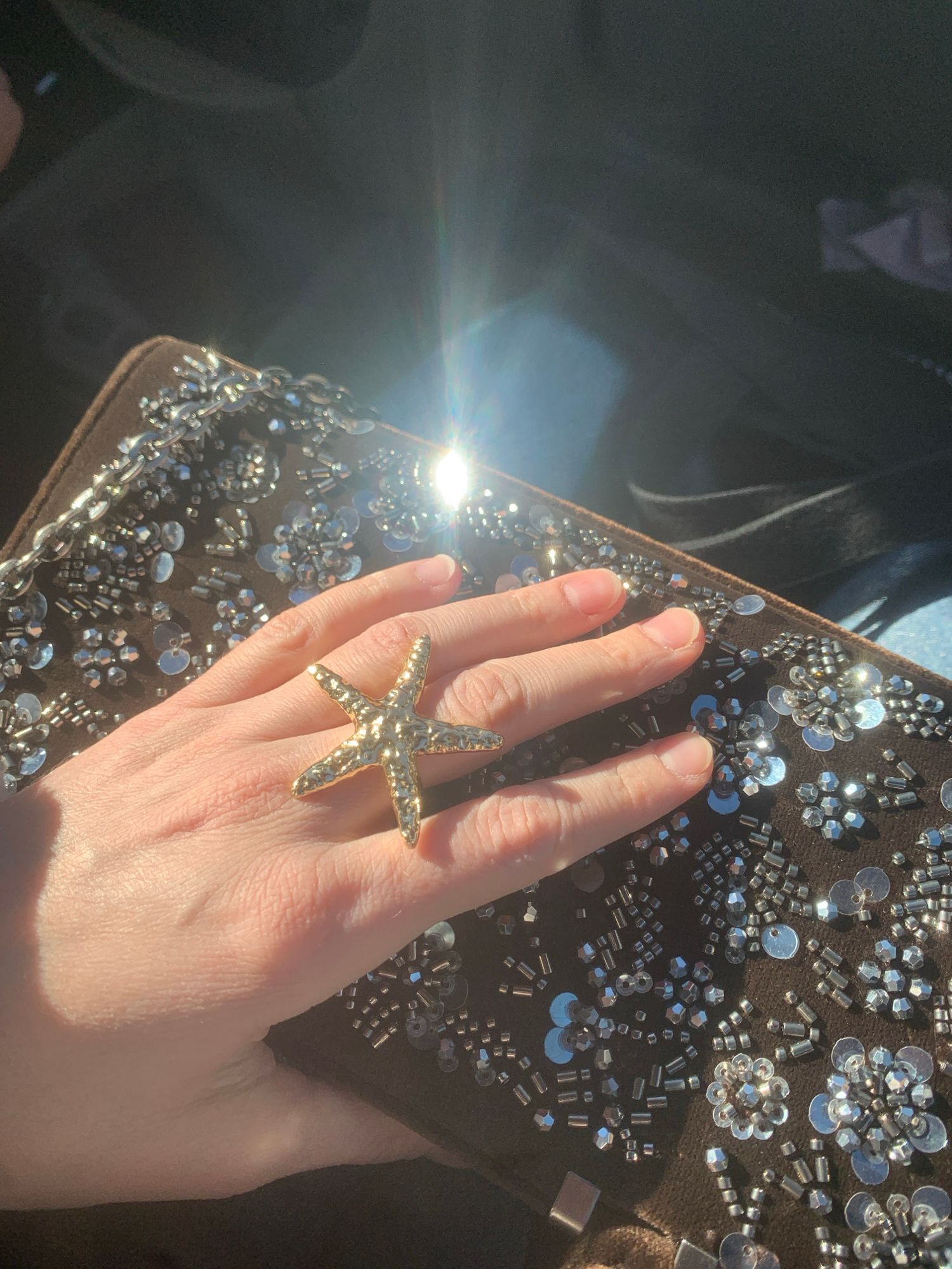 A hand wearing a gold starfish ring rests on a brown clutch bag embellished with silver beads and sequins. The image is taken in bright sunlight, creating a glare. The background is dark and indistinc…read more