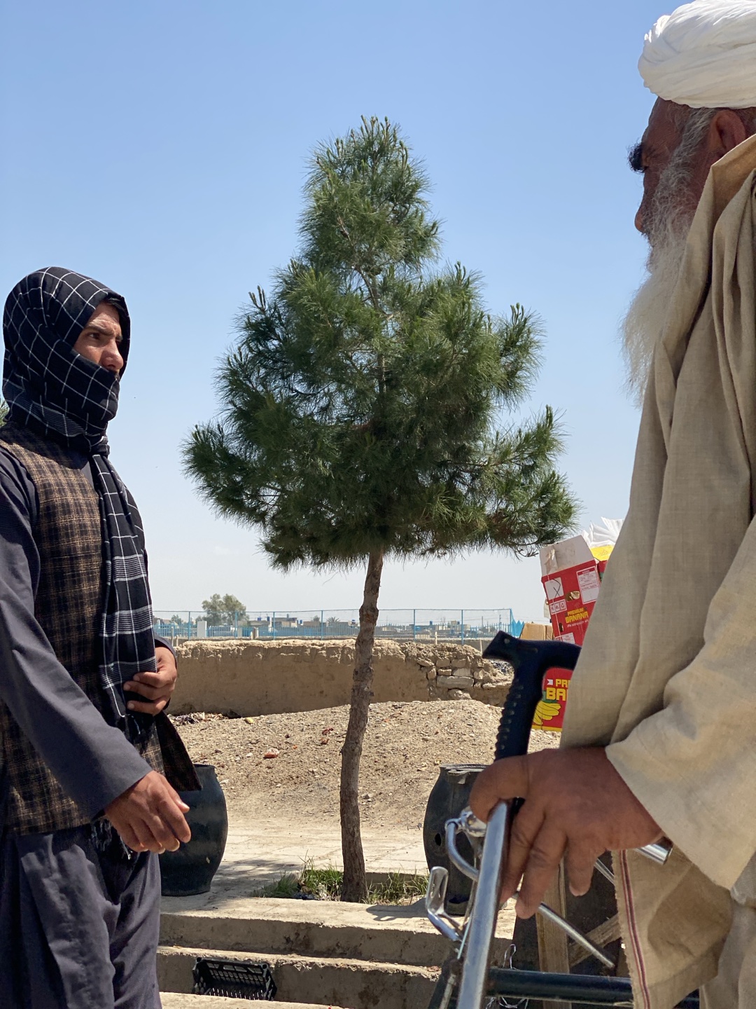 Two men are in conversation in Kandahar, Afghanistan. The man on the left, dressed in a gray vest, shirt, and pants, has a black-and-white checkered scarf covering his head and face. The man on the ri…read more