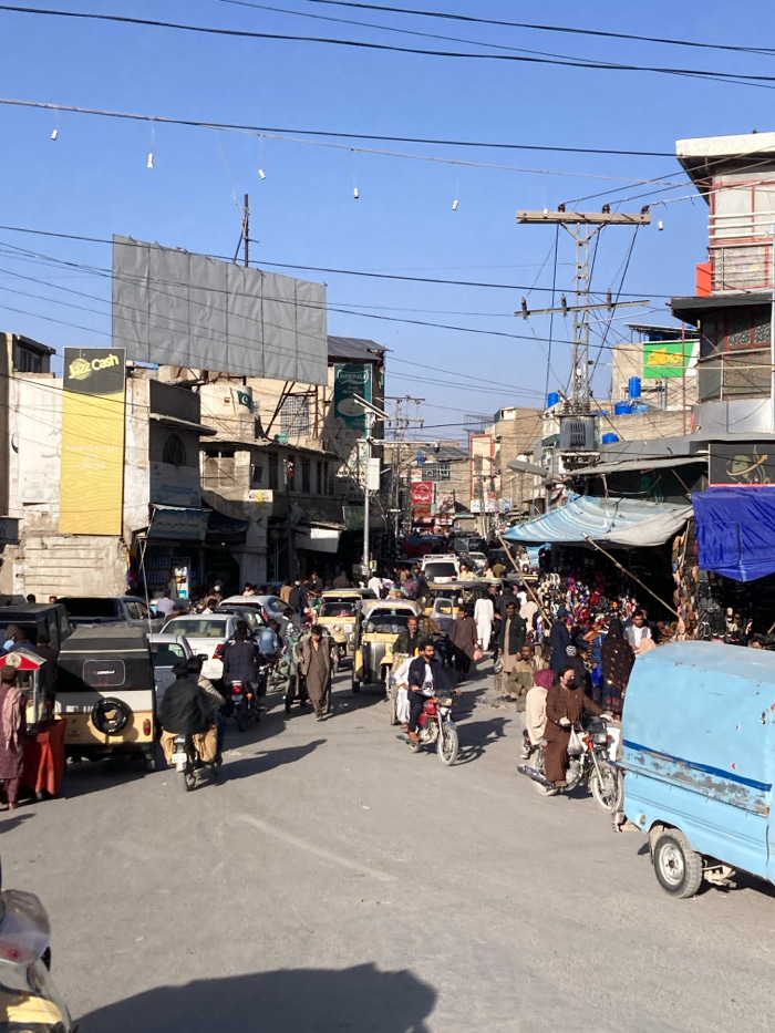 This image depicts a densely populated urban street in Quetta City Tehsil, Pakistan, under a clear blue sky. The street is a central thoroughfare characterized by heavy mixed traffic and pedestrian ac…read more