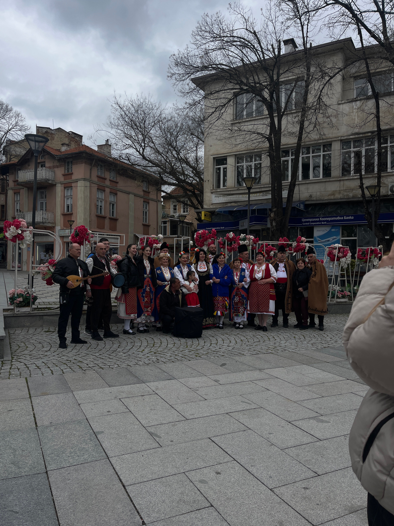 A horizontal, wide-angle medium shot of a gathering of people in the city of Velingrad, Bulgaria, appears to show a cultural performance or ceremony. The image is taken from a slightly elevated perspe…read more