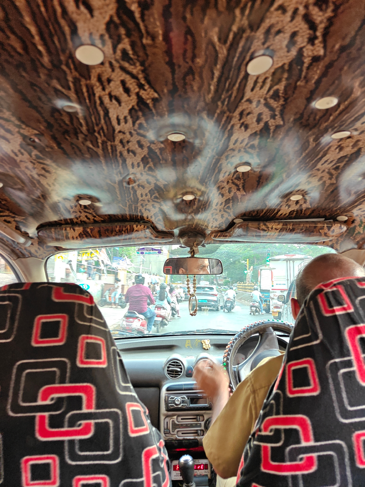 View from inside a car in Mumbai, India. The car's interior has patterned seat covers and a textured ceiling. The driver is visible from behind, steering the car in daytime traffic. The road ahead sho…read more