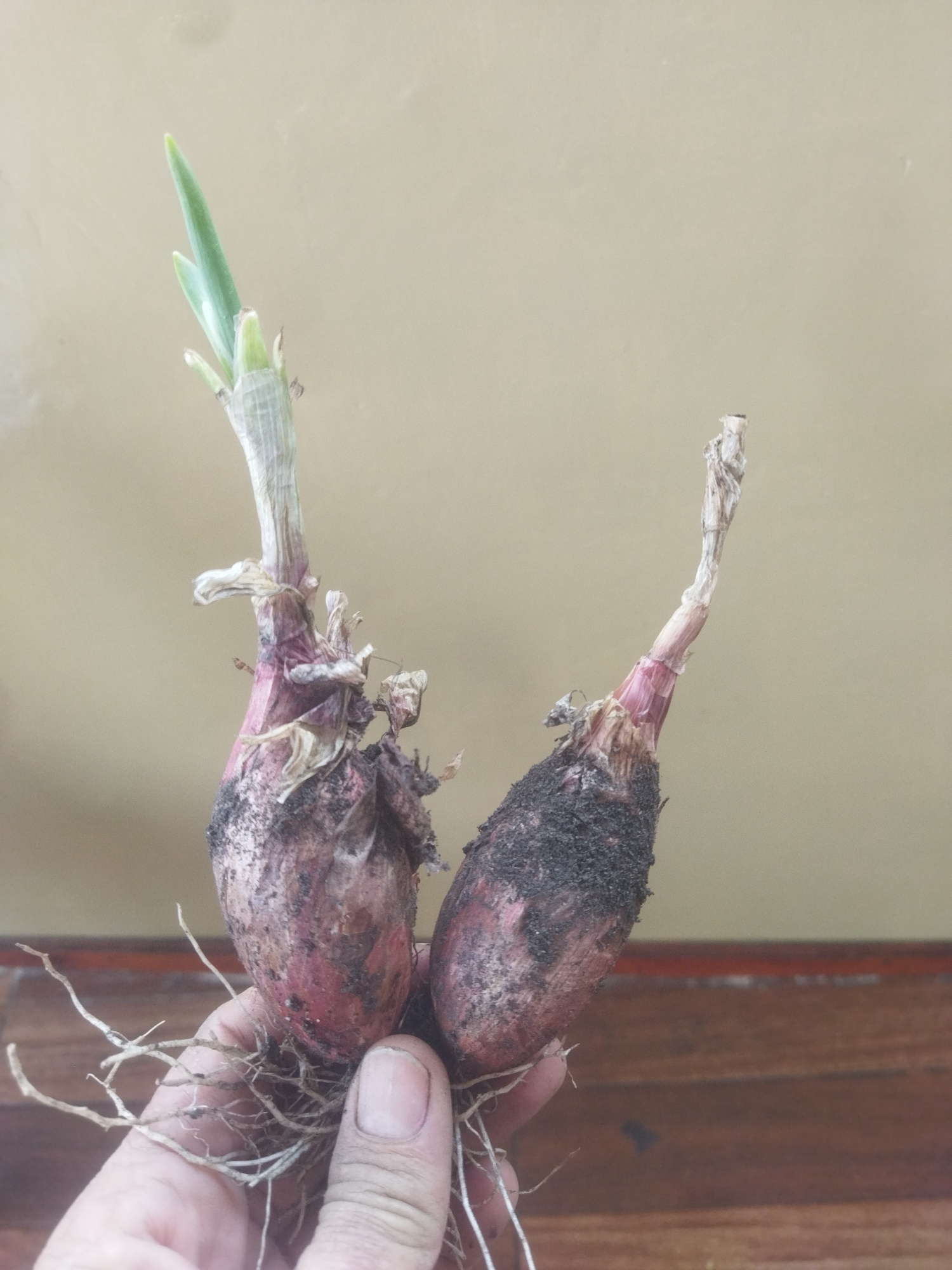 A hand holds two shallots, one with a green sprout and the other with a dry, withered stem. The shallots have roots and some dirt clinging to them. The background consists of a light beige wall and a…read more
