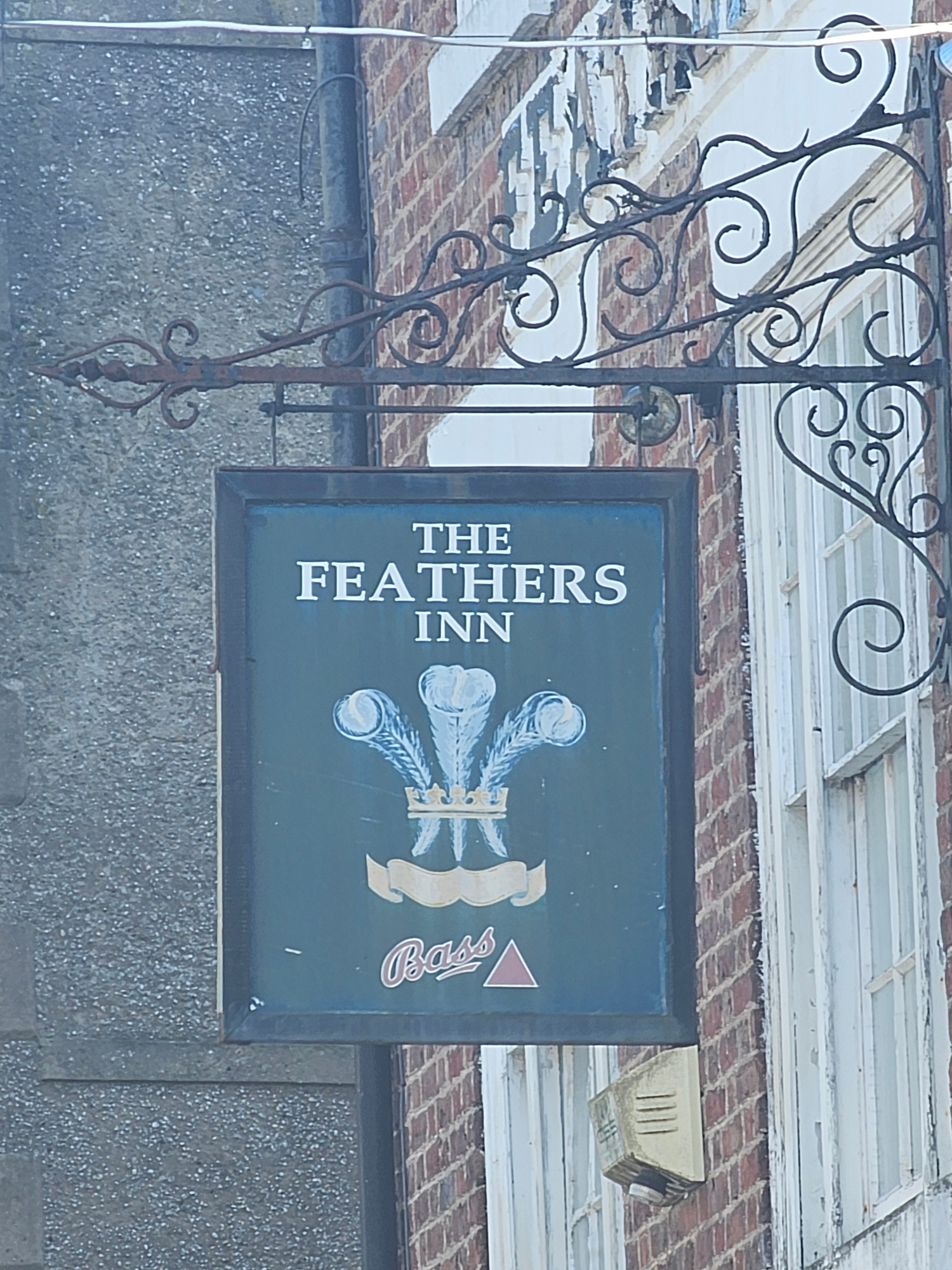 The image shows a pub sign, currently oriented 90 degrees clockwise, suspended from an ornate wrought iron bracket. The sign itself is rectangular with a dark green background, featuring white and gol…read more