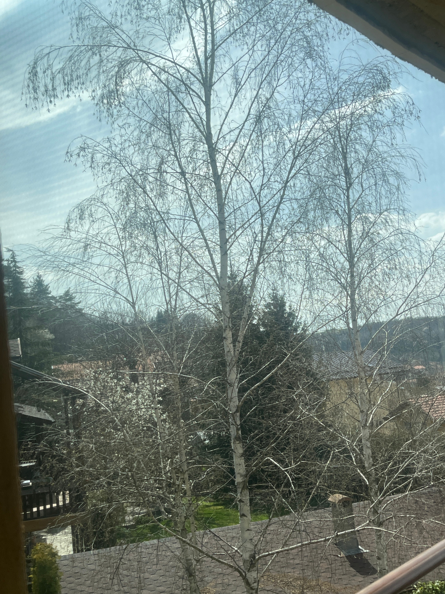 The image is taken through a window. Outside the window, there are two birch trees with bare branches against a cloudy, blue sky. The view also shows a brick building, greenery including grass and bus…read more