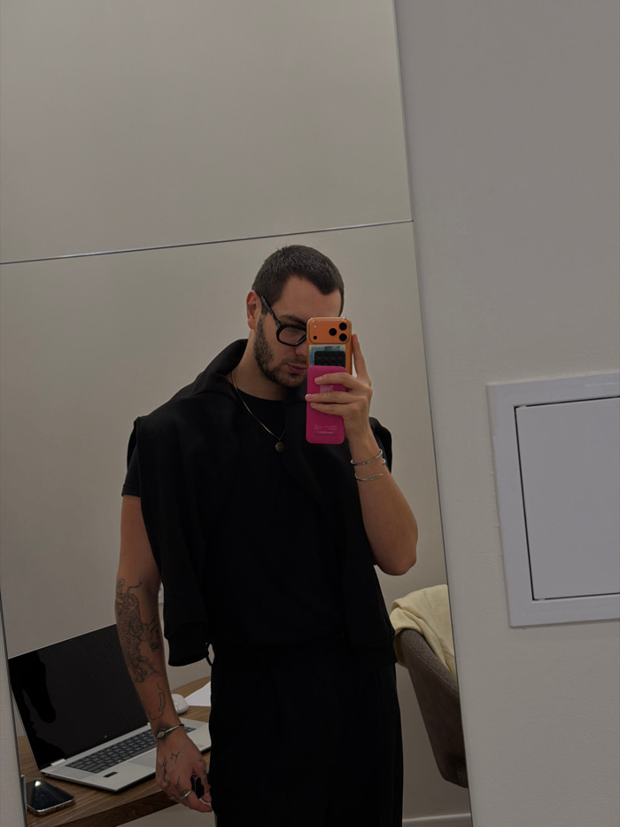 A male individual is depicted taking a mirror selfie indoors. He has short, dark hair, wears dark-rimmed glasses, and has a trimmed beard. He is dressed in a black short-sleeved top with a dark garmen…read more