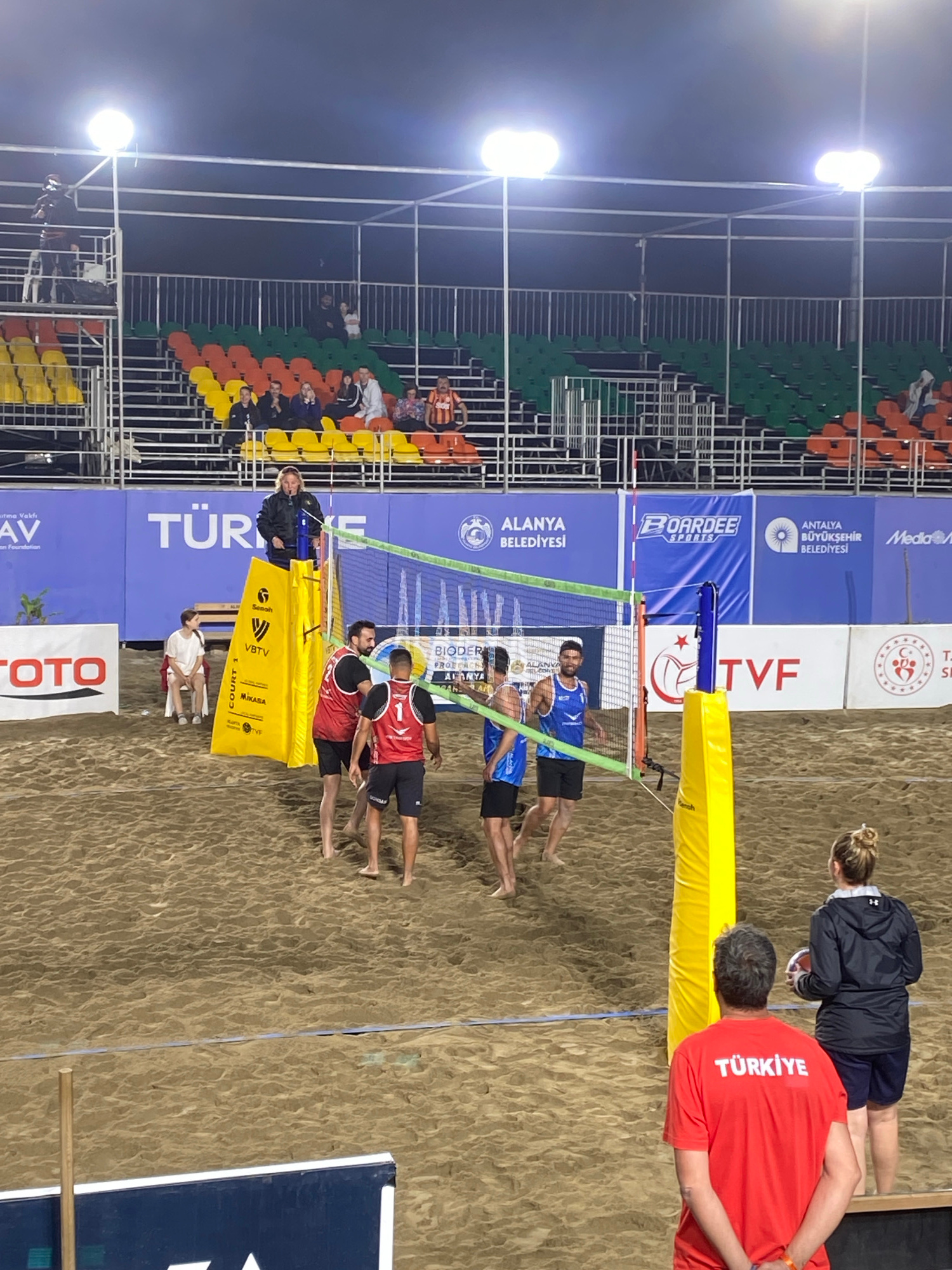 The image depicts a beach volleyball match, likely held in Alanya, Turkey, based on the banners and signage in the background. Two teams, one in red and black, and the other in blue and white, are pos…read more