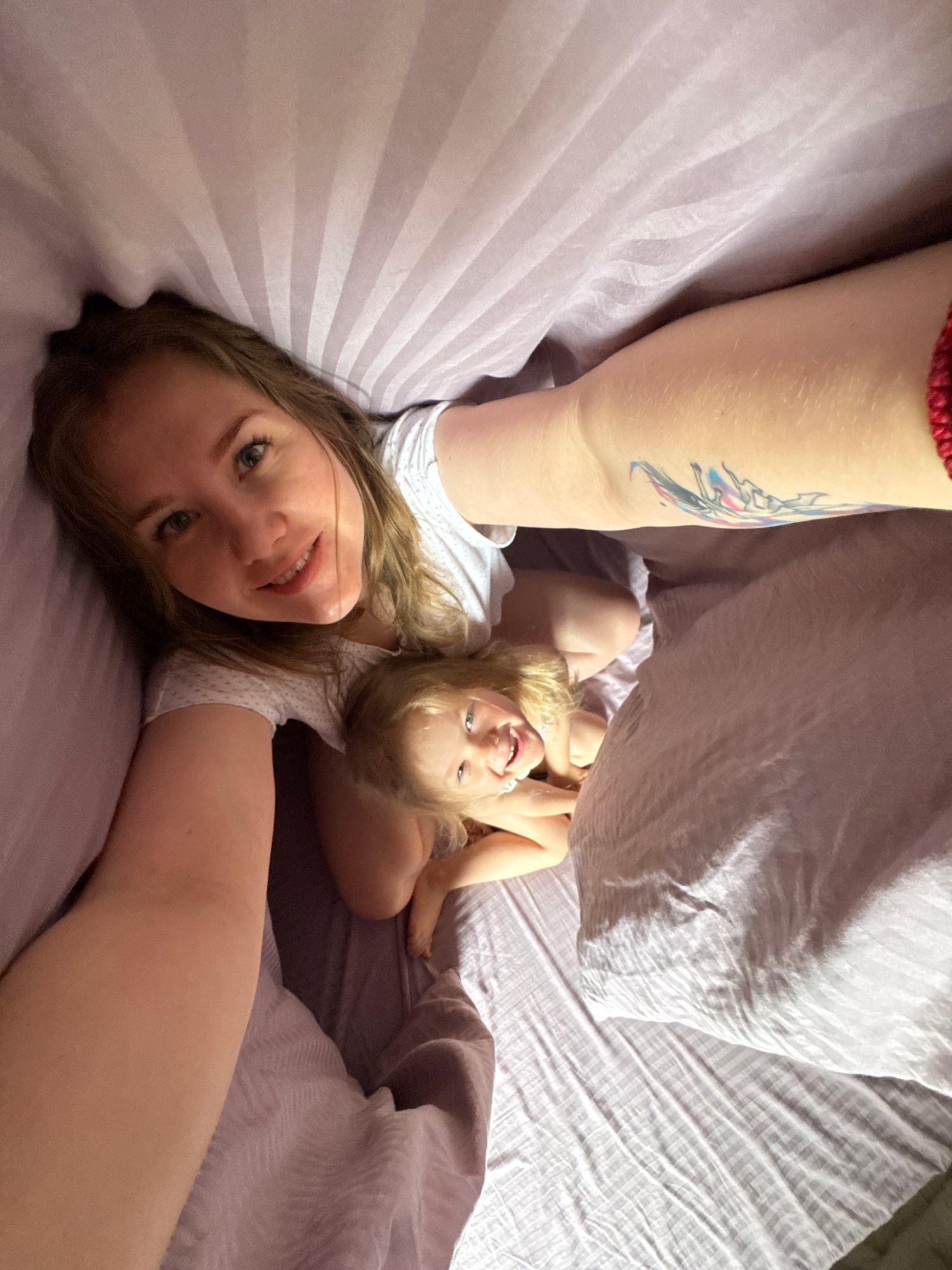 A light-skinned woman with long blonde hair lies on a bed with lavender-colored striped sheets. She is smiling at the camera. A young blonde-haired child with light skin is under the covers, also smil…read more