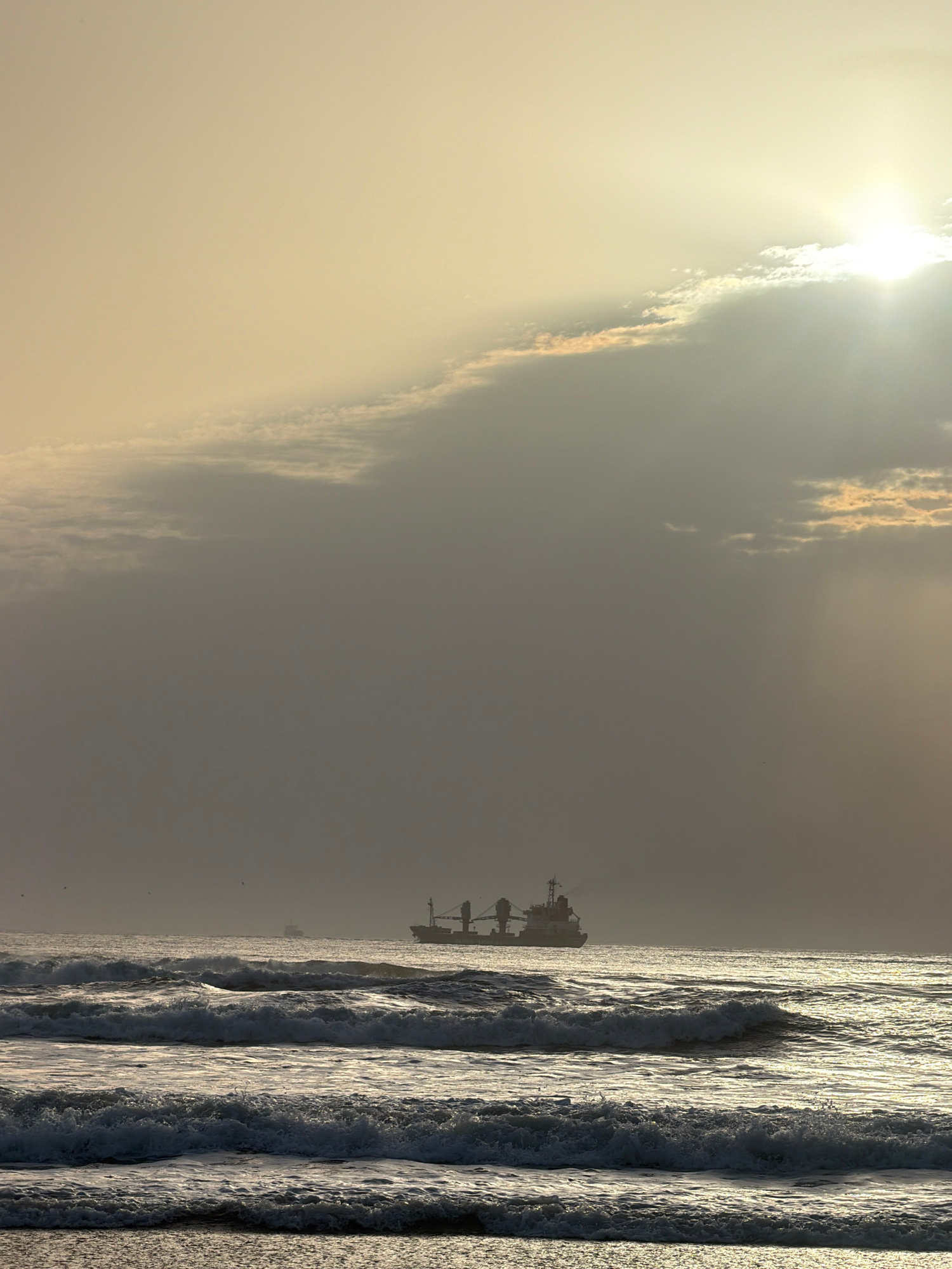 The image shows a beach scene, likely near Figueira da Foz, Portugal. Strong sunlight breaks through the clouds on the left side of the frame. The sea occupies the right side of the frame, with visibl…read more