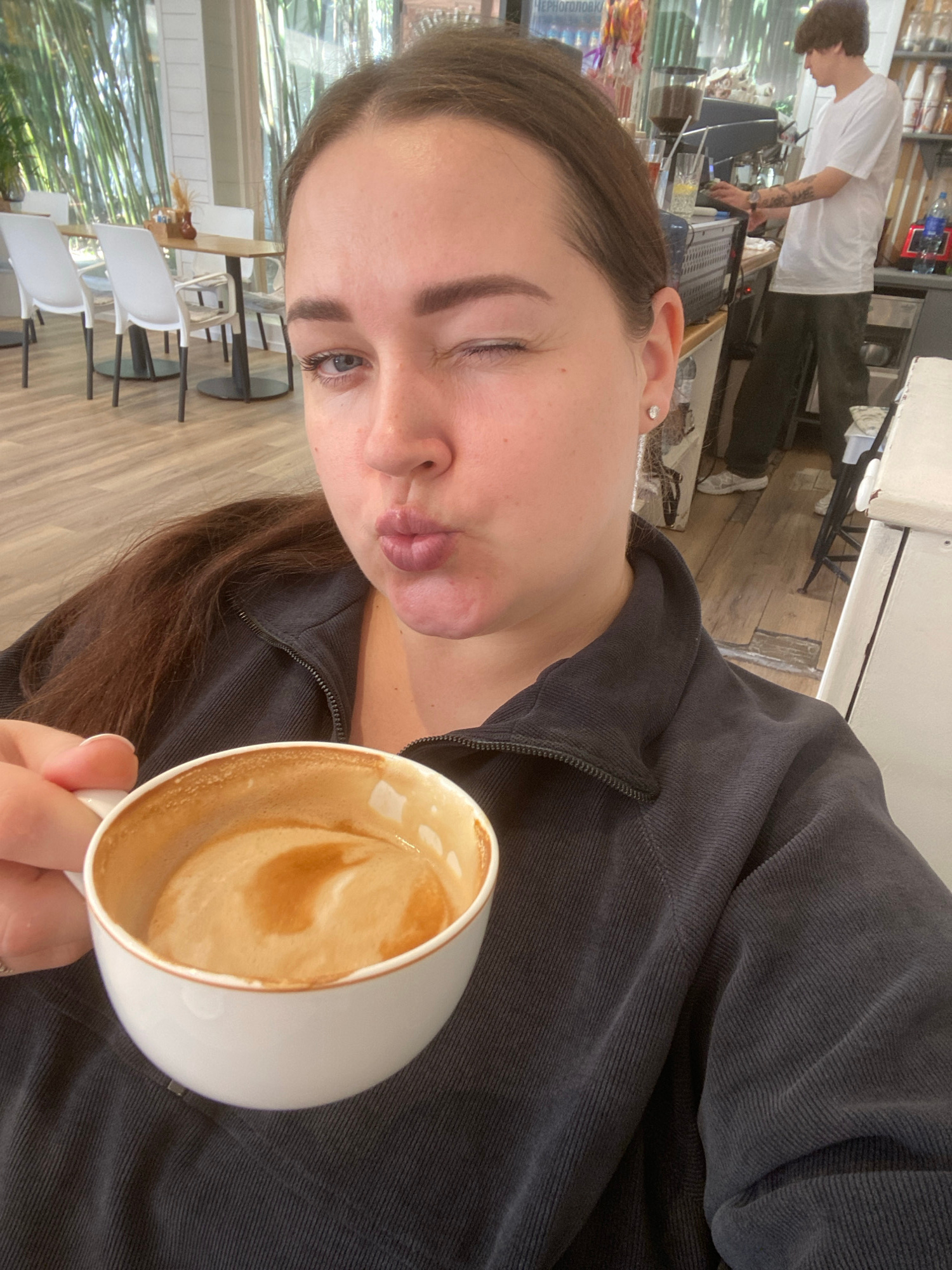 A woman holds a white mug containing a beverage with foam. She is partially facing the camera with one eye winking. She wears a dark, possibly corduroy, zipped garment. In the background, through a wi…read more