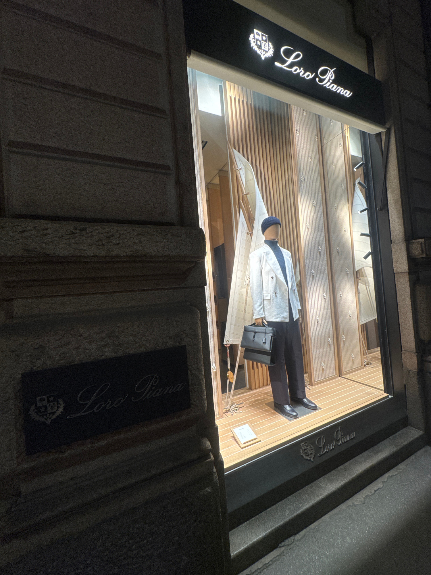 A nighttime outdoor shot of a Loro Piana store window in Milan, Italy. The camera angle is slightly tilted upwards towards the store window. The store is located on a street corner, as seen by the per…read more