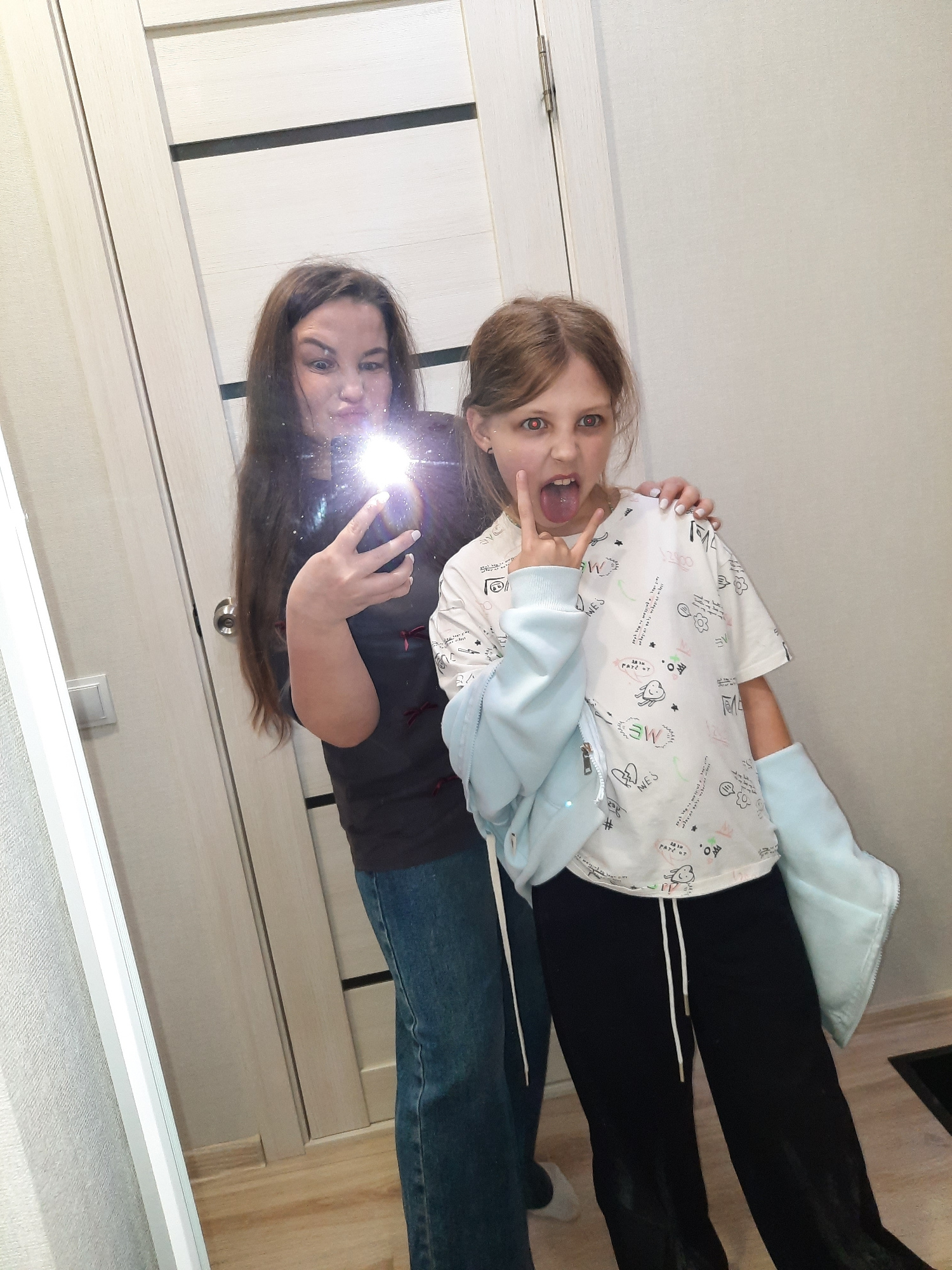 Two individuals are visible in the image, likely a reflection in a mirror. The older individual, presumed to be an adult, holds a mobile phone, possibly taking the picture. The phone's flash obscures…read more