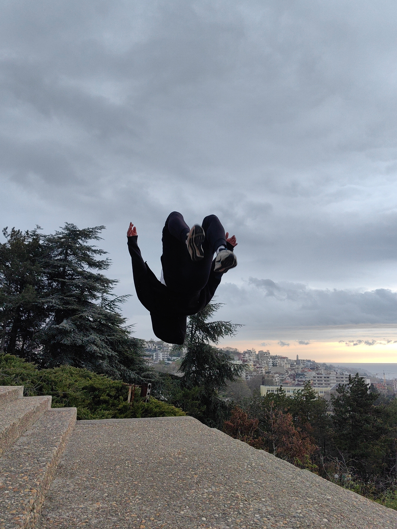 The image depicts a person in mid-air performing a backflip. The person is wearing black clothing and white sneakers. Their arms are extended upwards, and their body is inverted with their head pointiβ¦read more