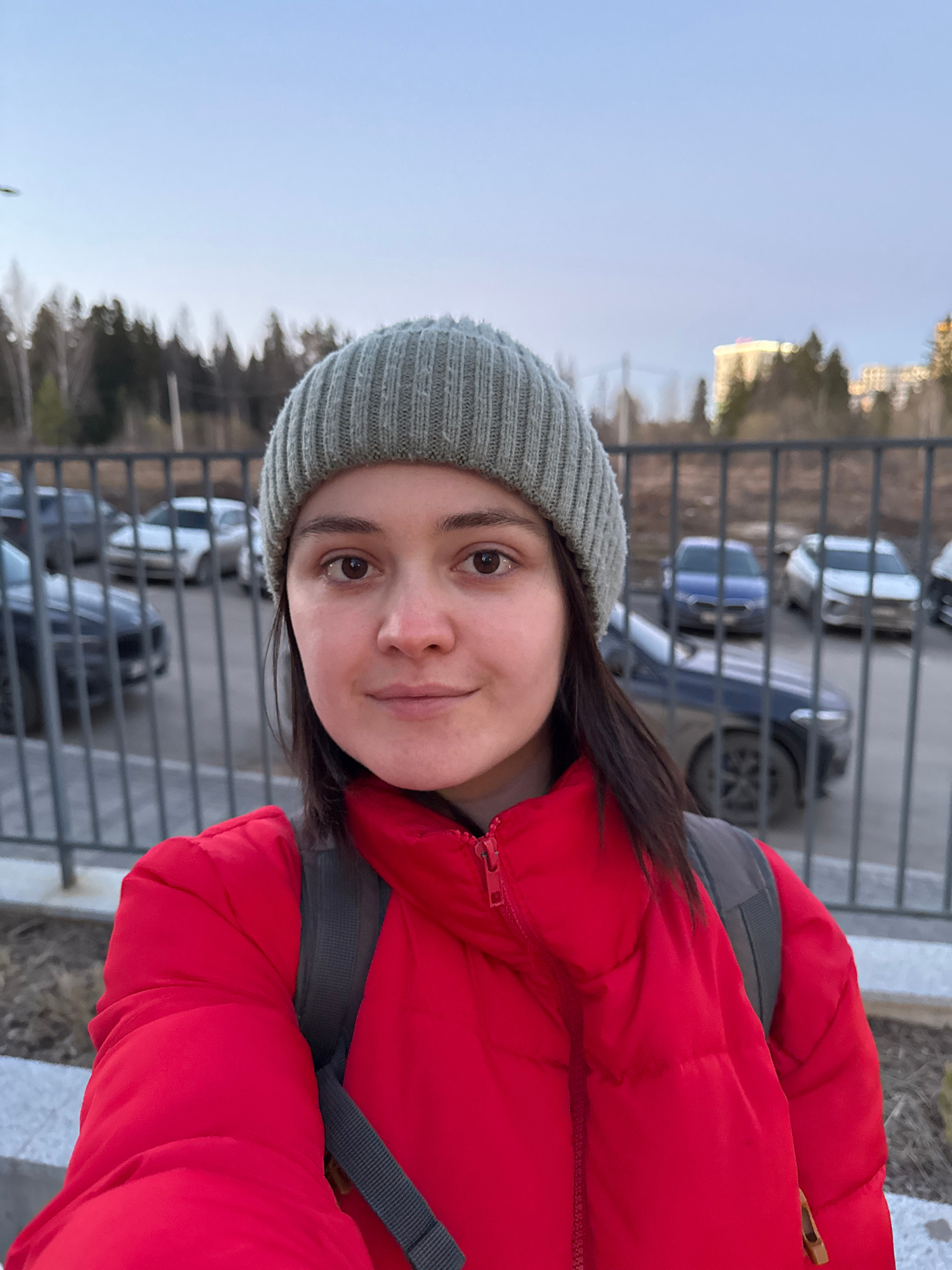 A woman in a red puffy jacket and gray knit hat stands in front of a metal fence. She is looking directly at the camera. Behind the fence is a parking lot with several cars. In the background, there a…read more