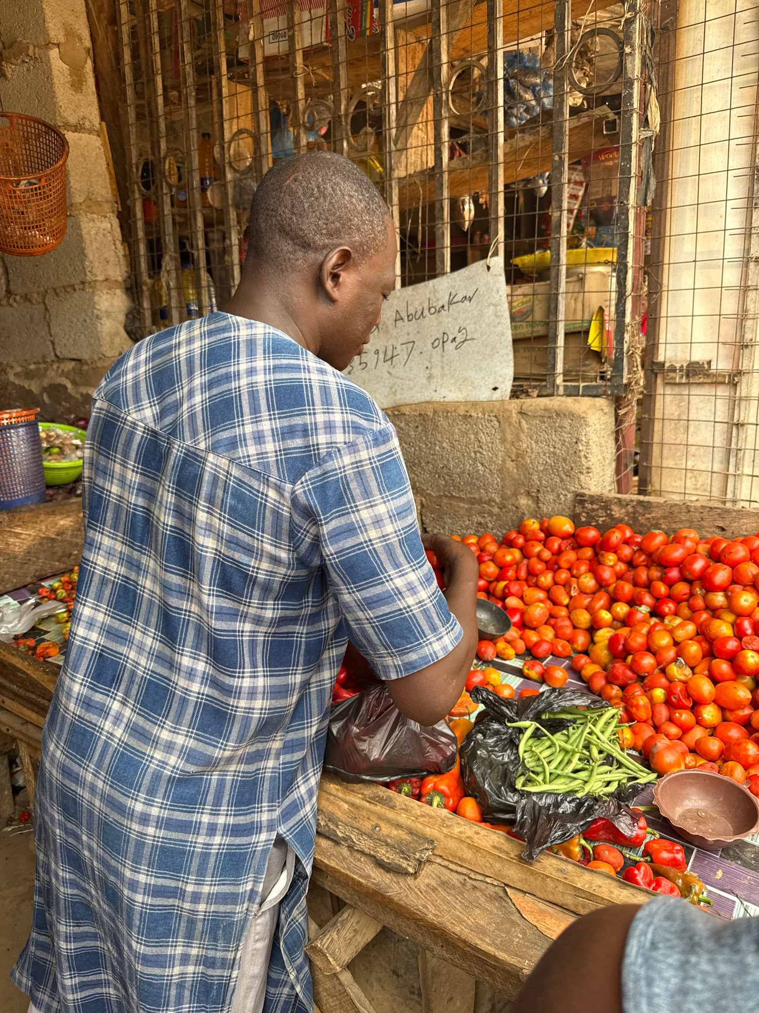 An adult man wearing a blue and white plaid shirt is standing at a market stall in Abuja, Nigeria. He is selecting tomatoes from a large pile of ripe, red tomatoes and placing them into a black plasti…read more