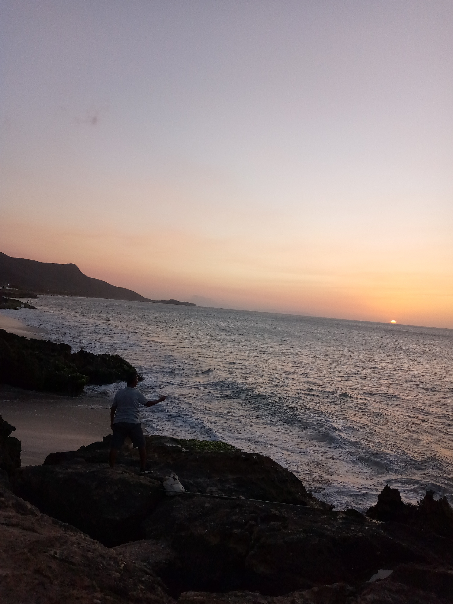 The image captures a sunset scene at Juan Griego, Venezuela. An adult male stands on a rocky outcrop, facing the ocean, possibly fishing. The sun is setting on the horizon, casting a warm orange glow…read more
