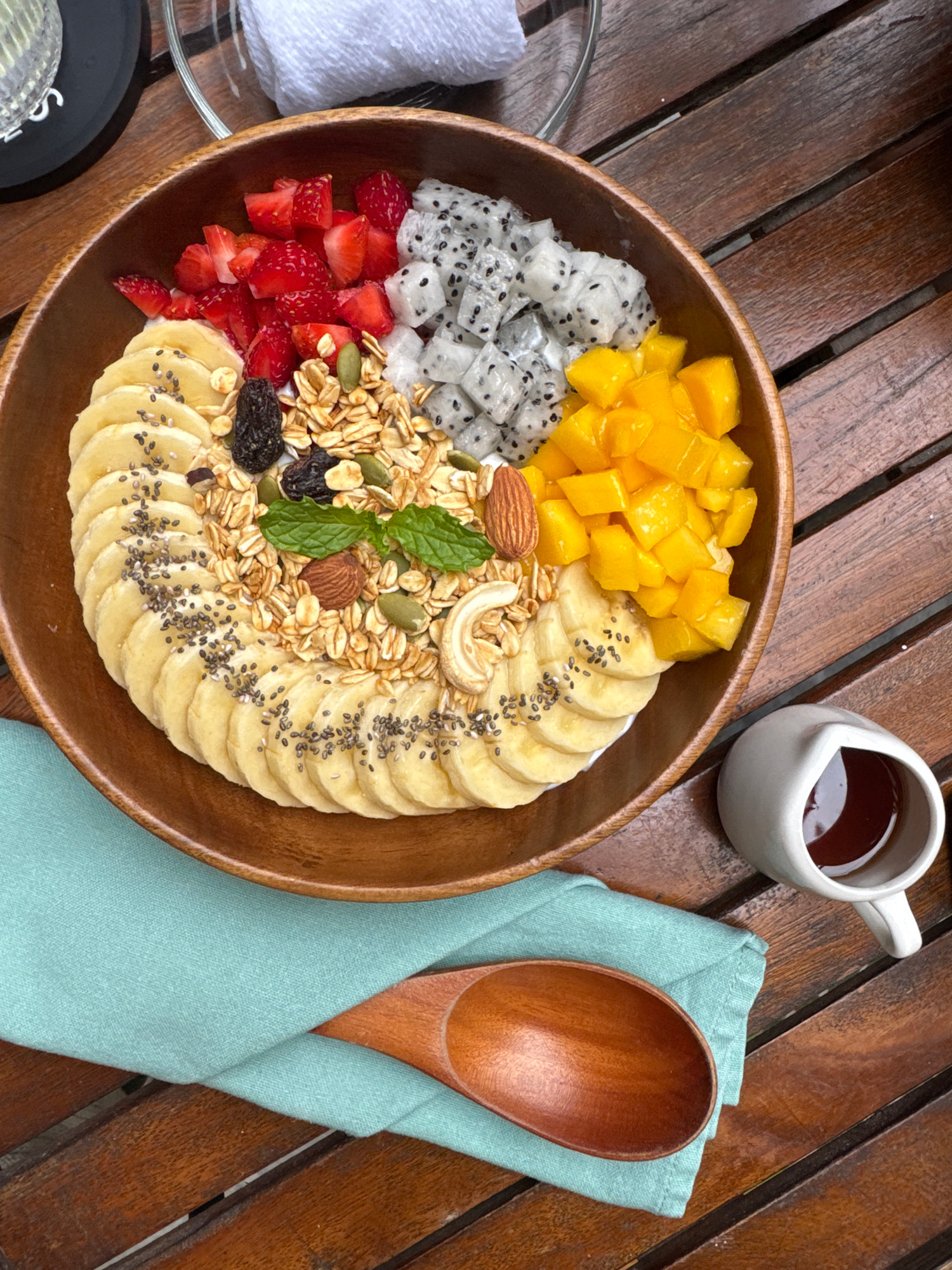 An overhead shot captures a vibrant and healthy smoothie bowl served on a dark wooden slatted table. The main subject is a large wooden bowl filled with a colorful array of fresh fruits, granola, and…read more