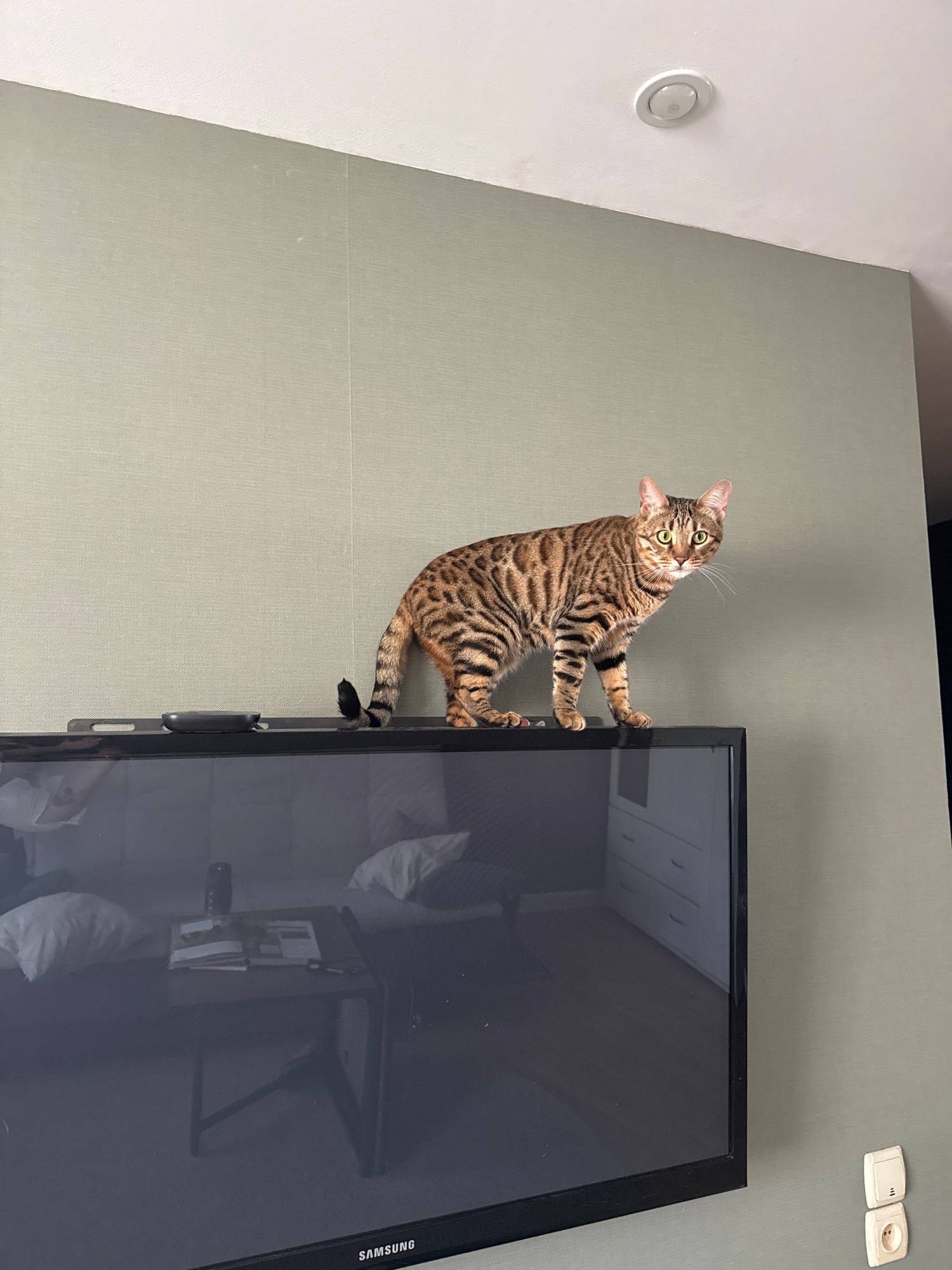 A tabby cat clings to the side of a Samsung television mounted on a light-green wall. The cat is looking upward and to the left. The wall has an electrical outlet and a circular light fixture. The ref…read more