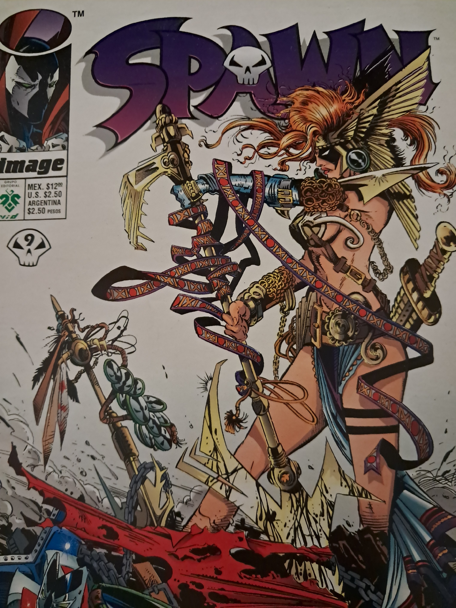 The image is a close-up of a Spawn comic book cover. The artwork features a female warrior figure with red hair, wearing a winged helmet, and adorned with various weapons and chains. She appears to be suspended or falling through the air, amidst a chaotic scene filled with weaponry and graphic elements. The Spawn logo is visible on the left, with a skull emblem beneath it. Text below the logo indicates "MEX. $1200 U.S. $2.50 ARGENTINA $2.50 PESOS." The city of Vicente López is not depicted within the provided image. | Open Wire