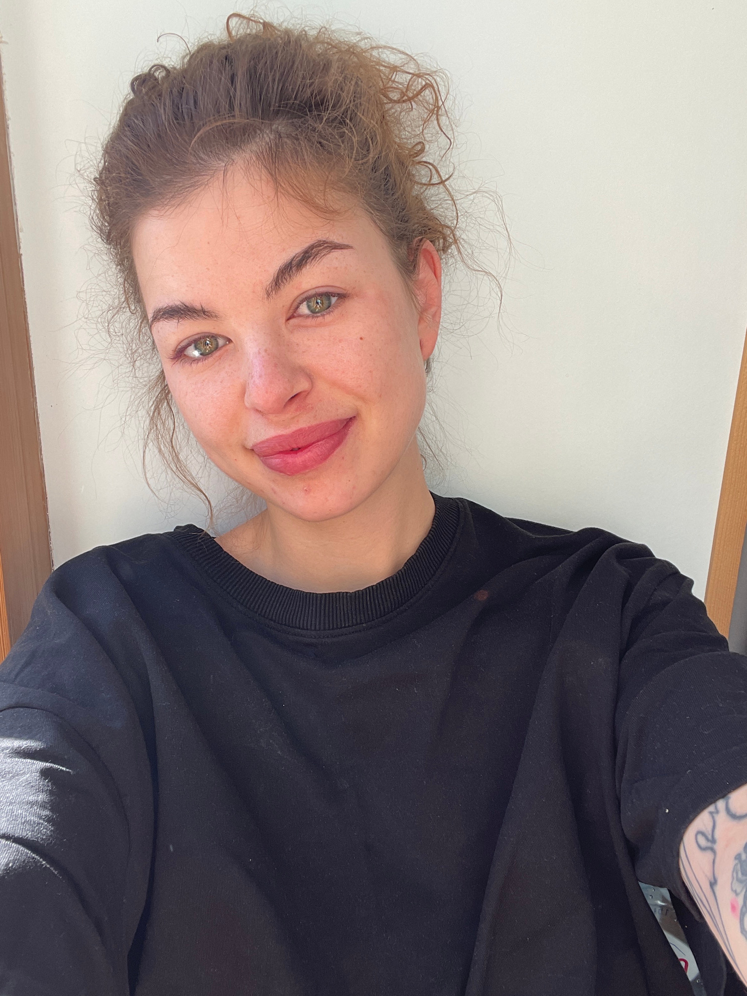 A woman with fair skin, green eyes, and light brown curly hair is pictured indoors against a white wall with a wooden trim along the base. She is wearing a black sweatshirt. Part of a tattoo is visibl…read more