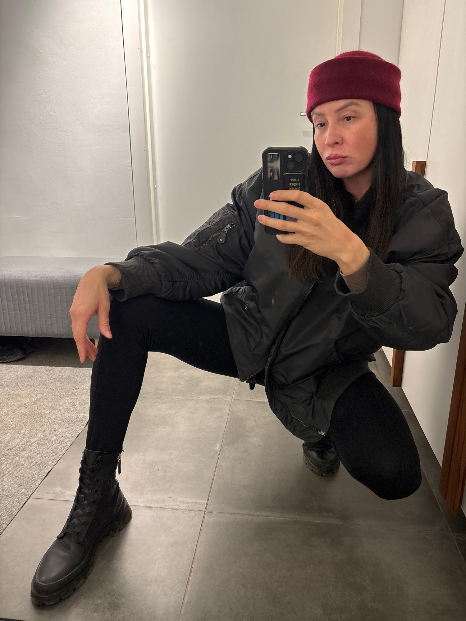 A woman with long dark hair and a maroon beret is squatting in a room with gray tile floors and light gray walls. She is wearing black leggings, black boots, and a black bomber jacket with a zippered…read more