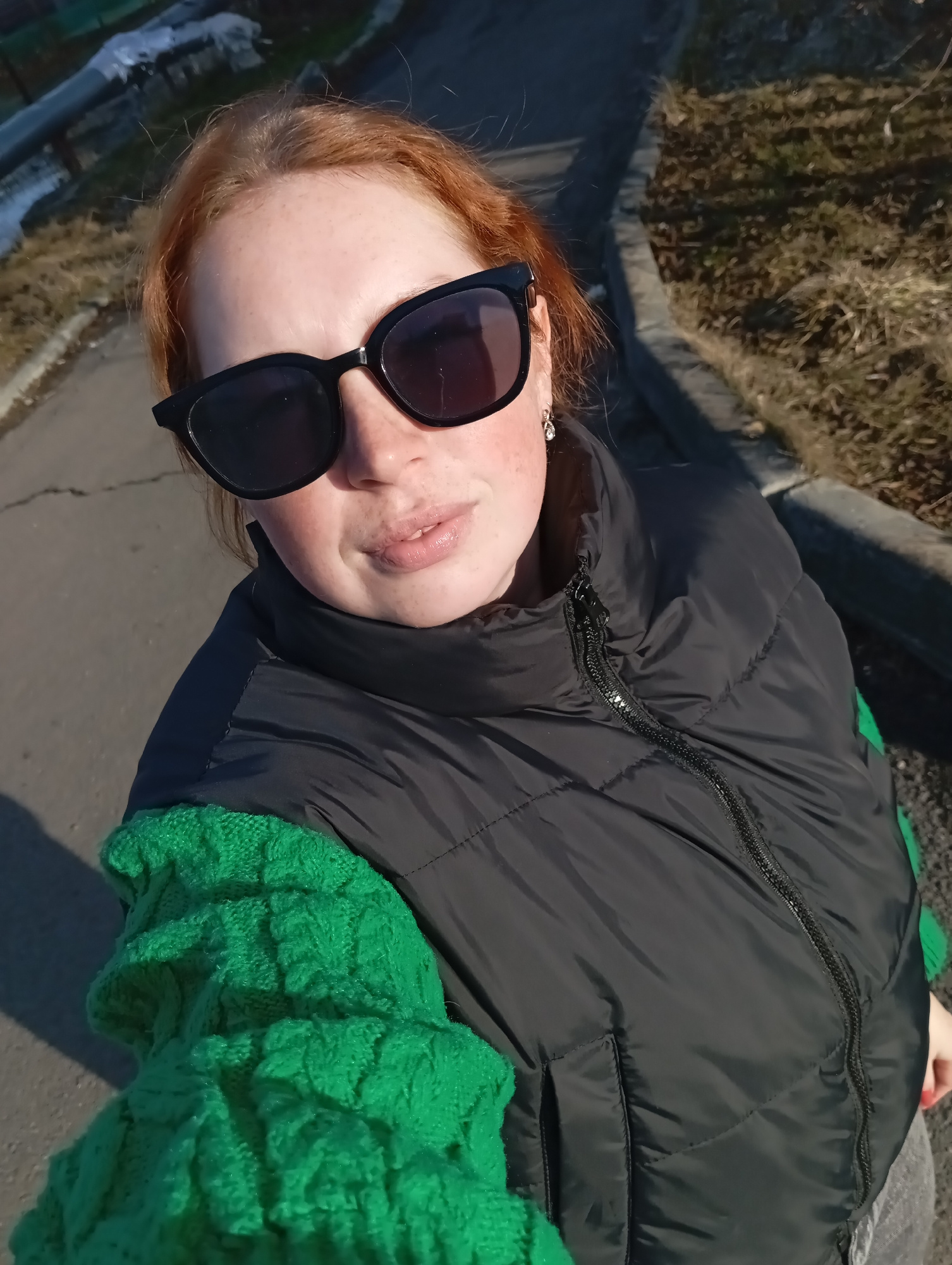 A person with red hair is wearing black sunglasses and a black puffer vest over a bright green sweater. They are outside, standing on a gray paved surface, possibly a sidewalk or road. Patches of dry…read more