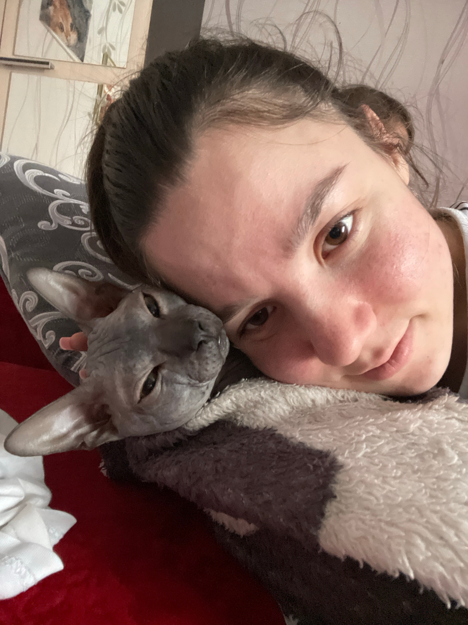 A rotated selfie shows a woman indoors, possibly in a domestic setting. She has fair skin, brown hair pulled back in a bun, and brown eyes. A hairless cat, likely a Sphynx, is nestled against her neck…read more