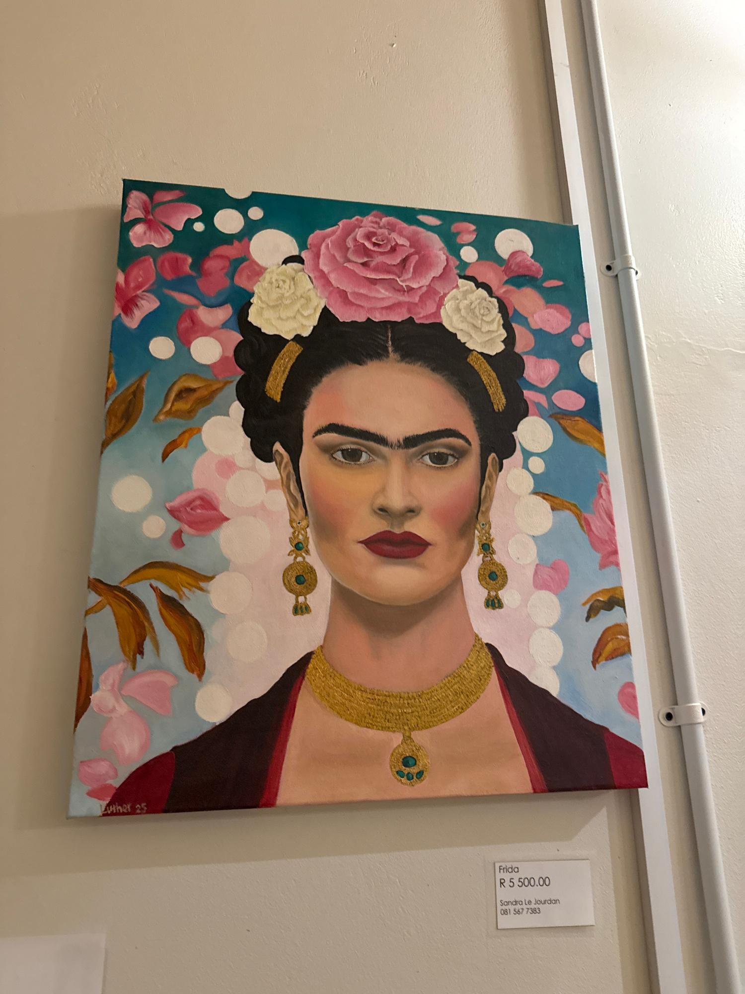 The image shows a painting of Frida Kahlo hanging on a wall. The painting is predominantly blue and pink, with white dots and floral designs. The subject, Frida, is adorned with flowers in her hair anβ¦read more