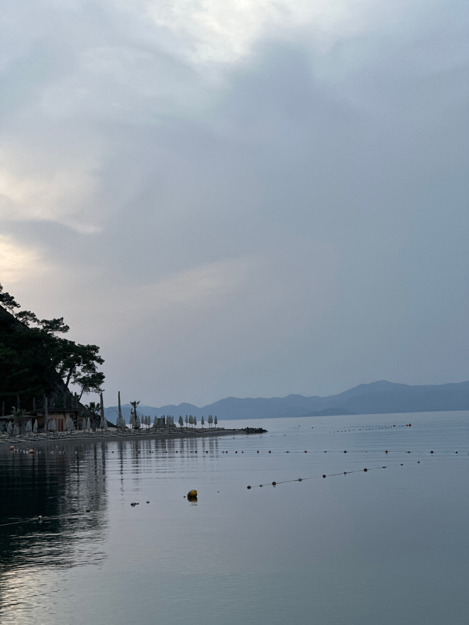 The image captures a tranquil coastal scene, likely in Fethiye, Turkey, during what appears to be either early morning or late afternoon. The main subjects include a calm body of water, a beach with r…read more