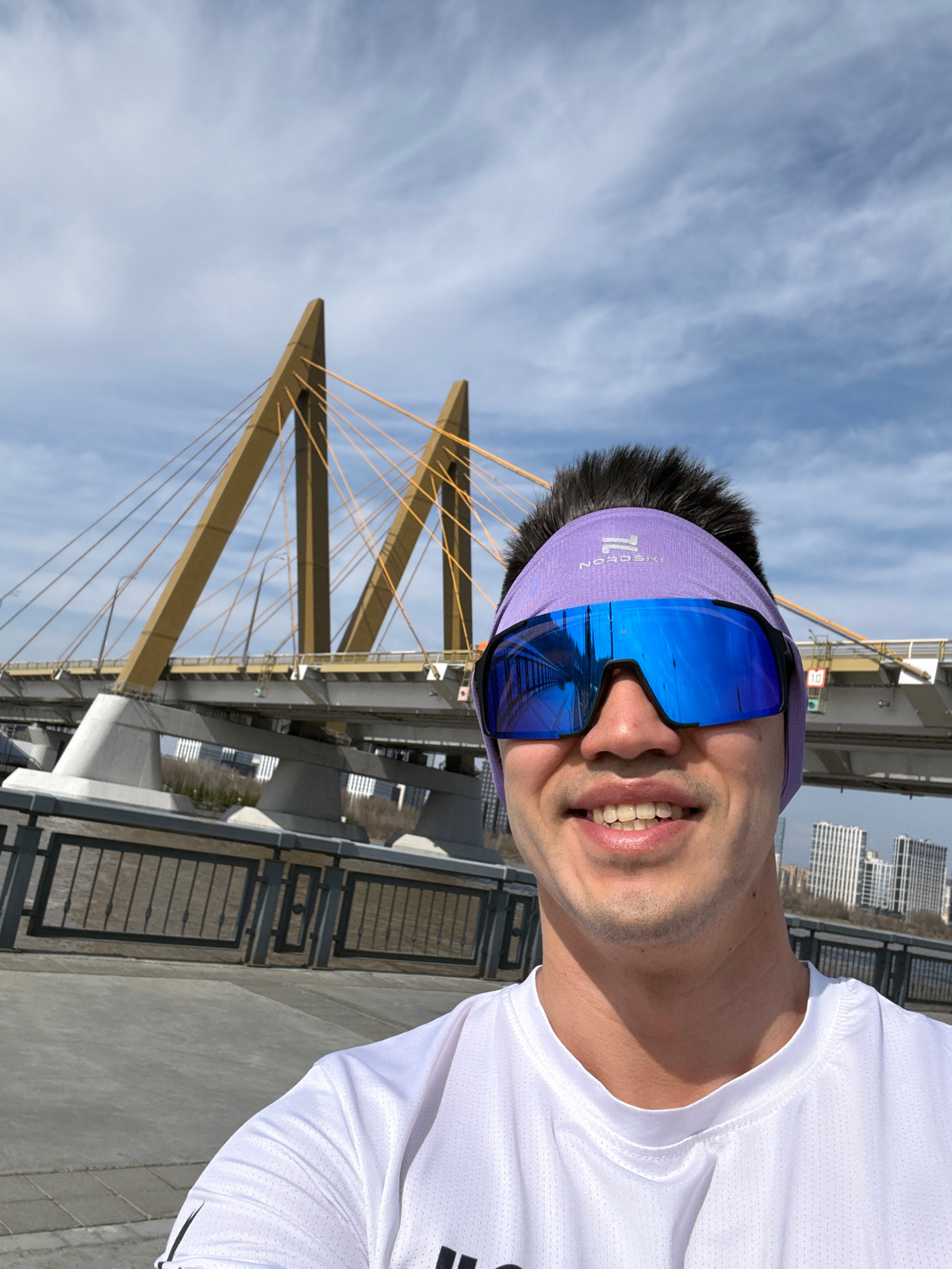 A smiling man in a white athletic shirt and blue sunglasses with a purple headband is the central subject. The sunglasses reflect an image of railway tracks. Behind him is a cable-stayed bridge with y…read more