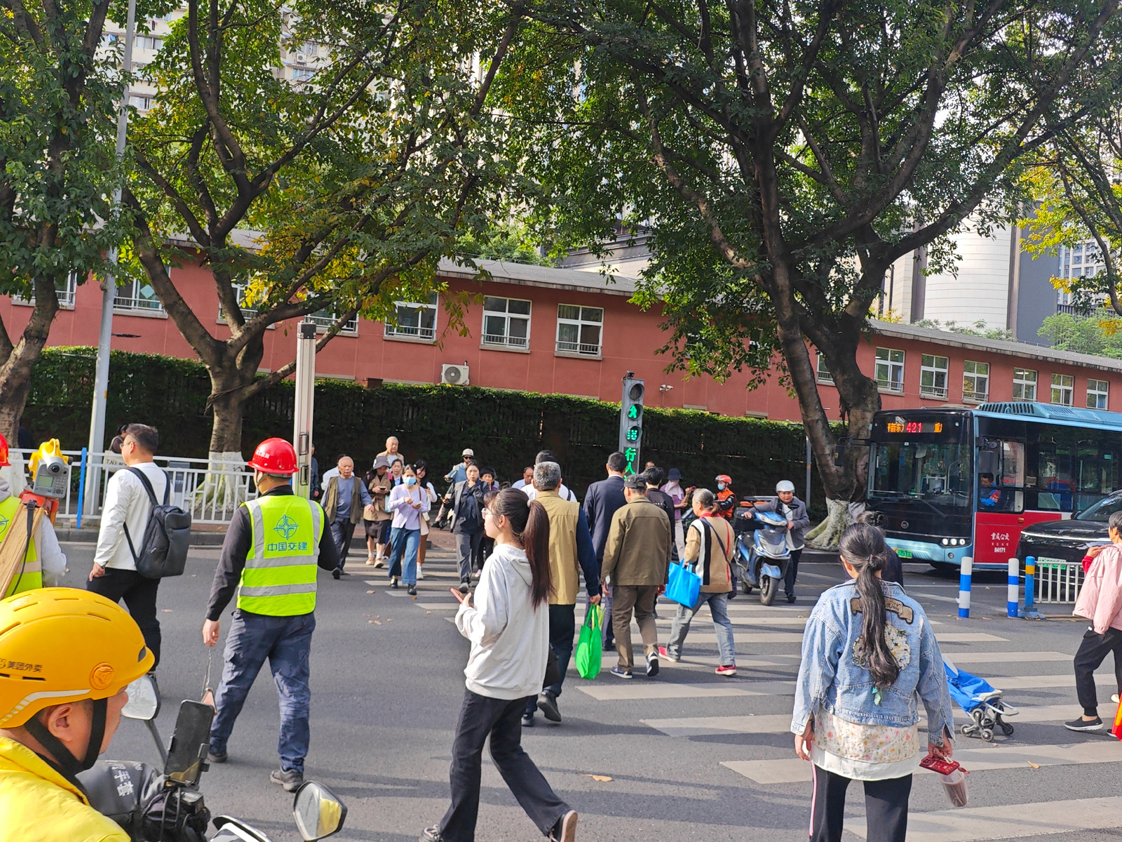 The image depicts a bustling street scene in an urban area, likely Yuzhong District, China, focusing on a crosswalk populated by numerous pedestrians. The time of day appears to be daytime, with clear…read more