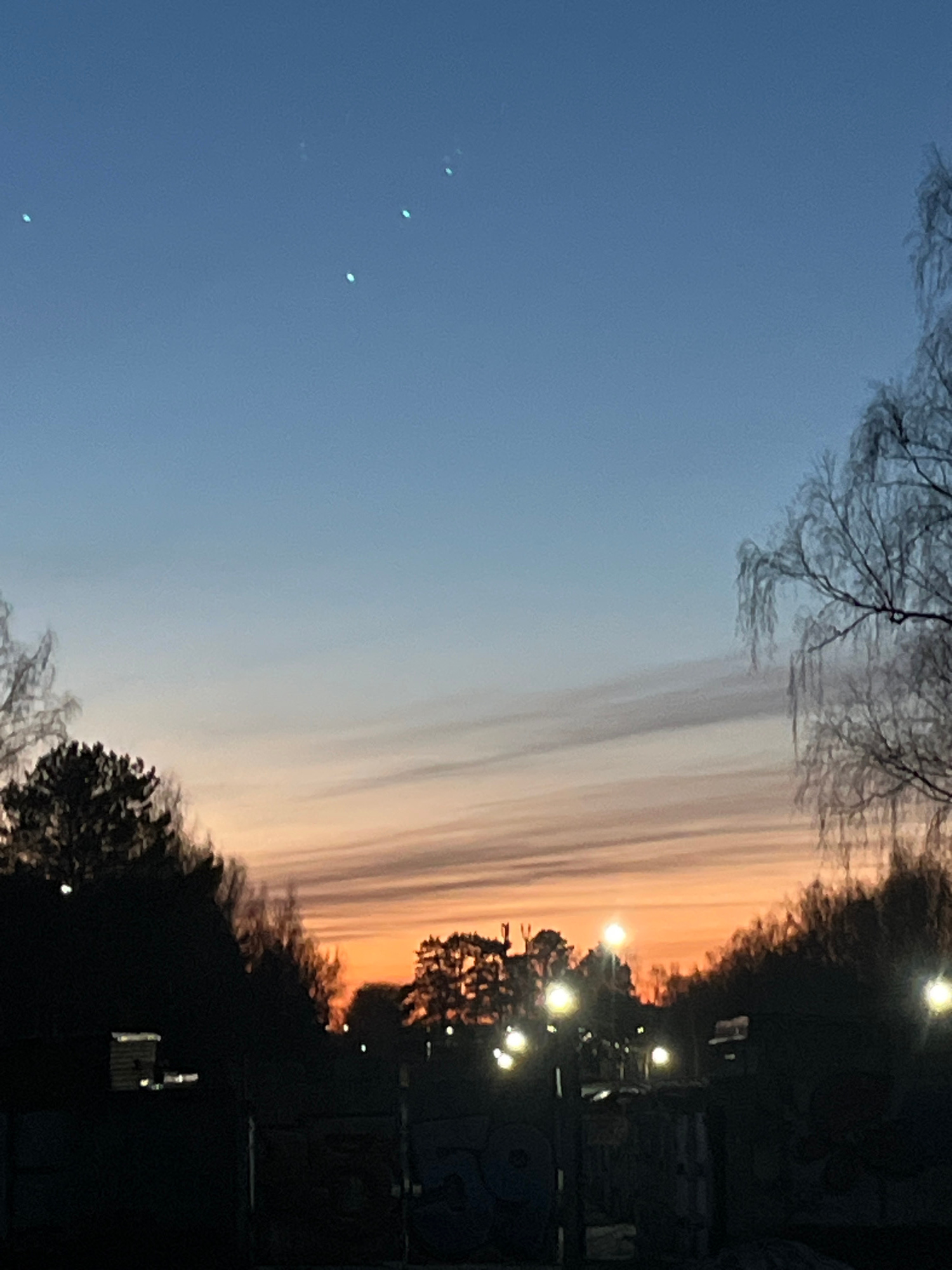 The image depicts a dusk scene in Chaikovsky, Russia. The sky transitions from a blue on the left side to a golden-orange hue on the right. The horizon is obscured by silhouetted trees and streetlight…read more