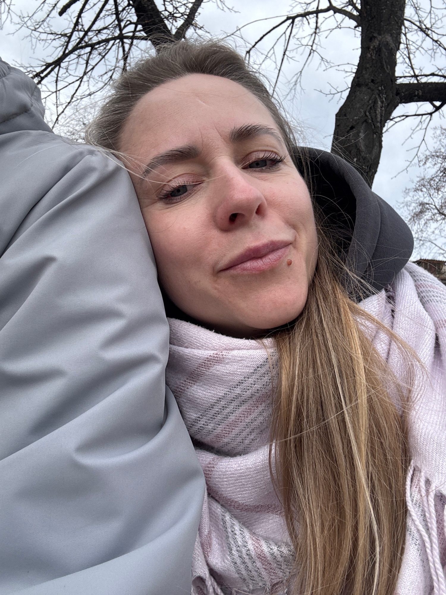 A woman lies with her head resting on a light gray padded surface, possibly a jacket or coat. She is wearing a dark gray hooded sweatshirt and a light pink and white patterned scarf is wrapped around…read more