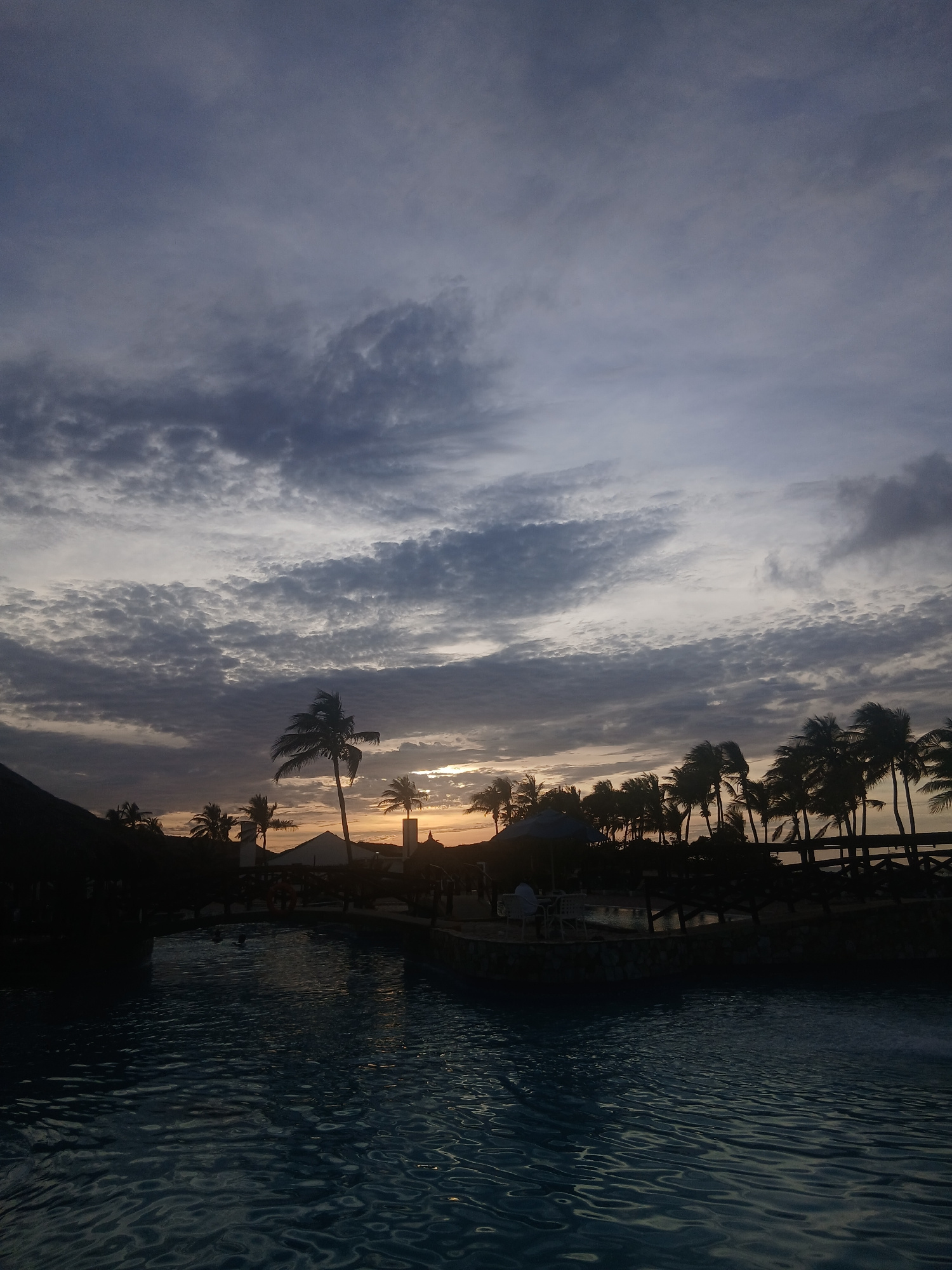 The image shows a landscape at sunset. On the right side of the image, there is a body of water, likely a pool or ocean, with noticeable surface ripples. Along the edge of the water, palm trees and ot…read more