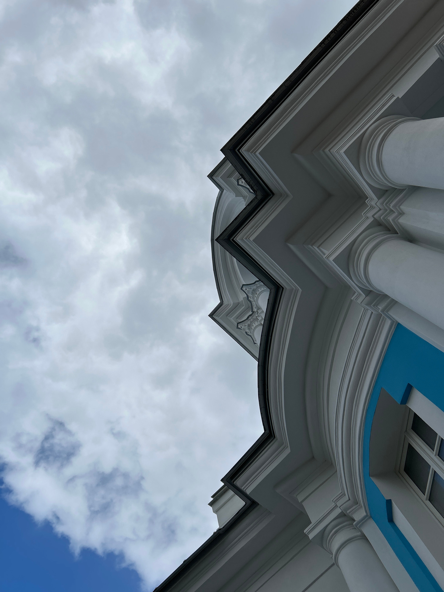 The image shows an upward view of a building exterior, featuring ornate white architectural details, including columns and layered molding. Part of a blue ceiling is visible. The rest of the frame is…read more