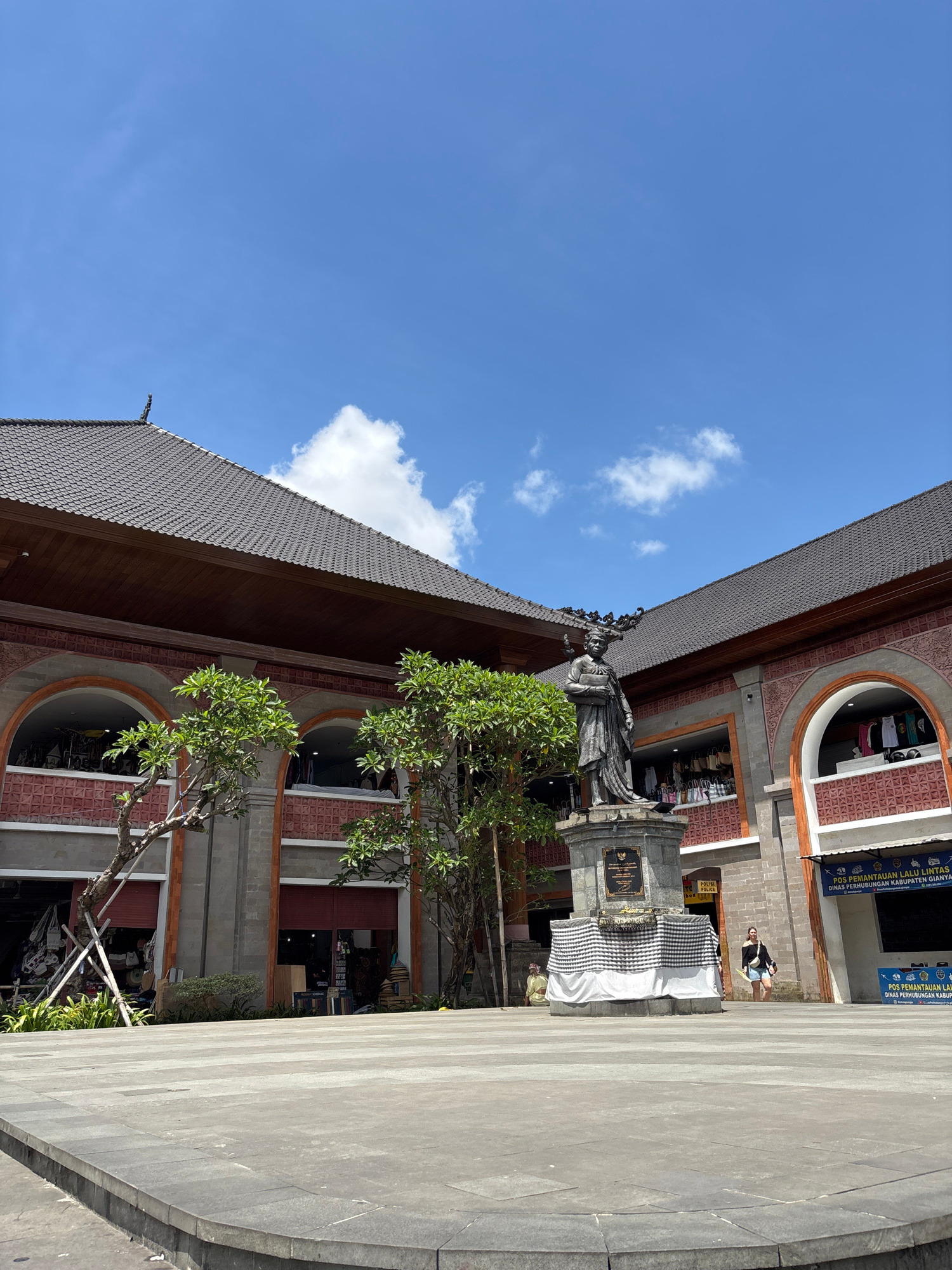 The image shows an outdoor scene in what appears to be Ubud District, Indonesia. The focal point is a stone monument or structure, draped with a checkered cloth and topped with a statue. The monument…read more
