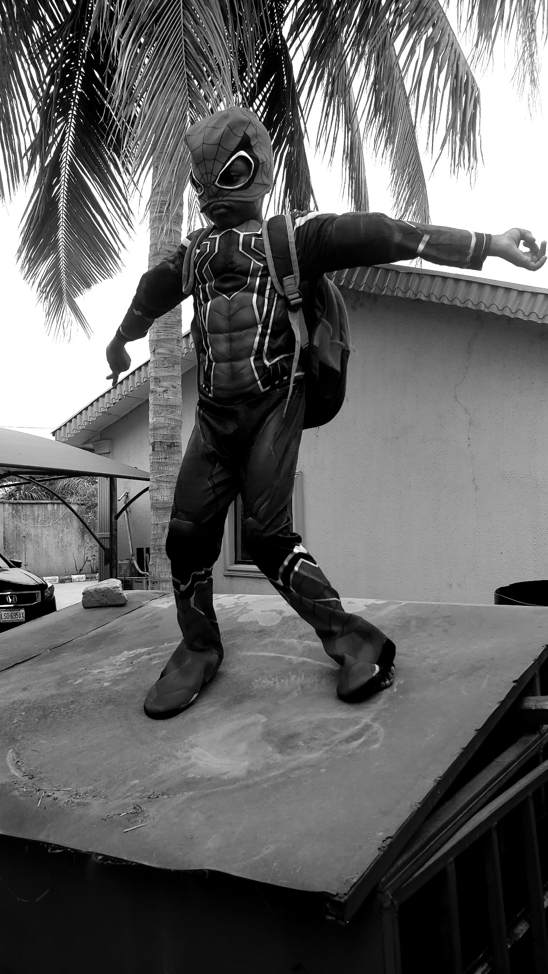 A person wearing a Spider-Man costume is standing on the edge of a building or platform. One hand is raised towards palm tree branches and the other is reaching downward. The person is wearing a backp…read more