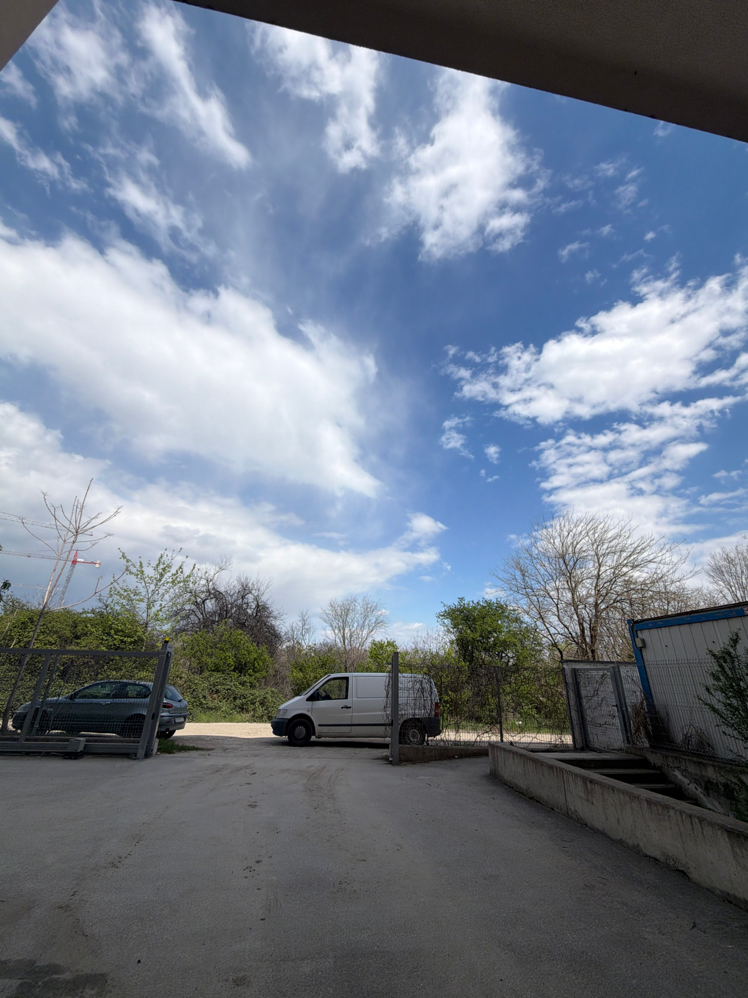 The image depicts an outdoor scene in Plovdiv, Bulgaria, featuring a partly cloudy sky. A concrete structure partially frames the left side of the image. A parking area is visible, with a white van pā¦read more