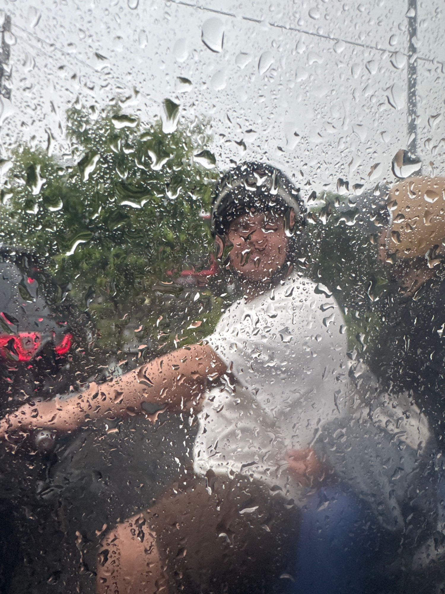 The image presents a view through a wet glass surface, likely a window or windshield, covered extensively with numerous raindrops that distort the scene beyond. The perspective is from an interior loo…read more