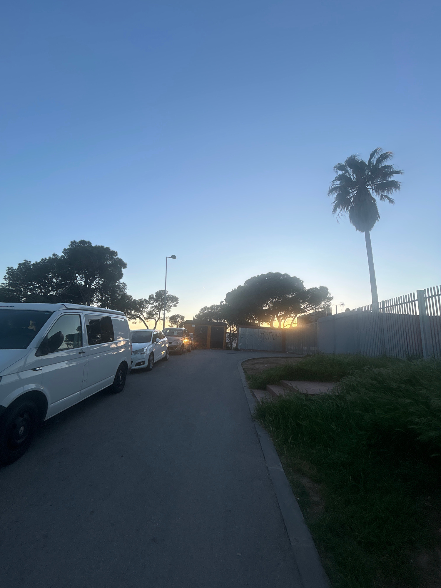 The image depicts an urban street scene in Badalona, Spain, during what appears to be early morning or late afternoon, judging by the low angle of the sun. The street is lined with parked vehicles, in…read more