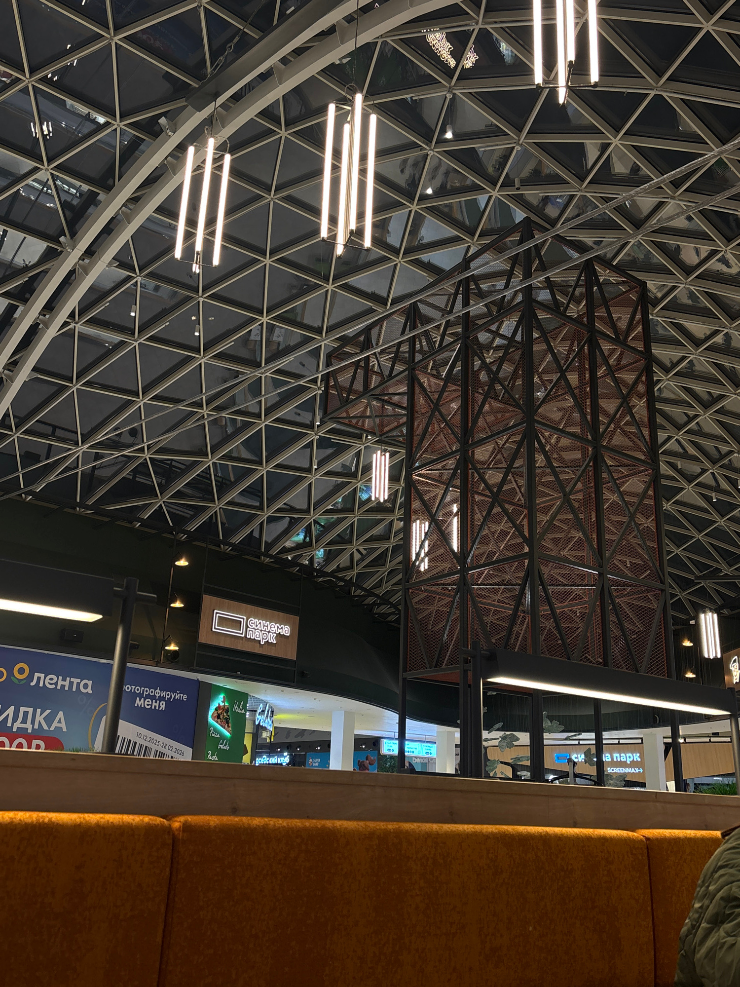 The image shows the ceiling of a shopping mall in Perm, Russia. The ceiling is a dome with a network of triangular glass panels supported by a white metal frame. Several long, horizontal, fluorescent…read more