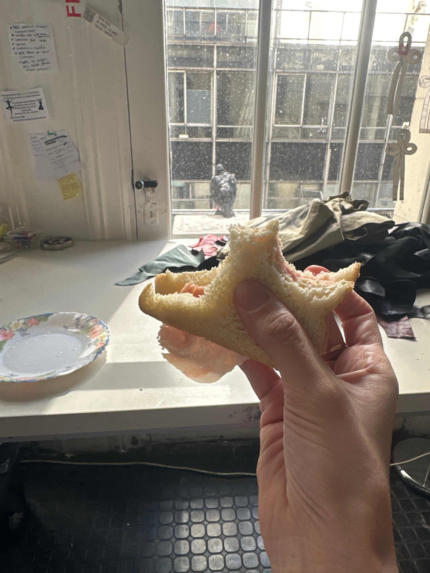 The image shows a person holding a partially eaten sandwich in their hand. The sandwich appears to contain bread and some kind of meat filling. In the background, there is a multi-paned window with a…read more
