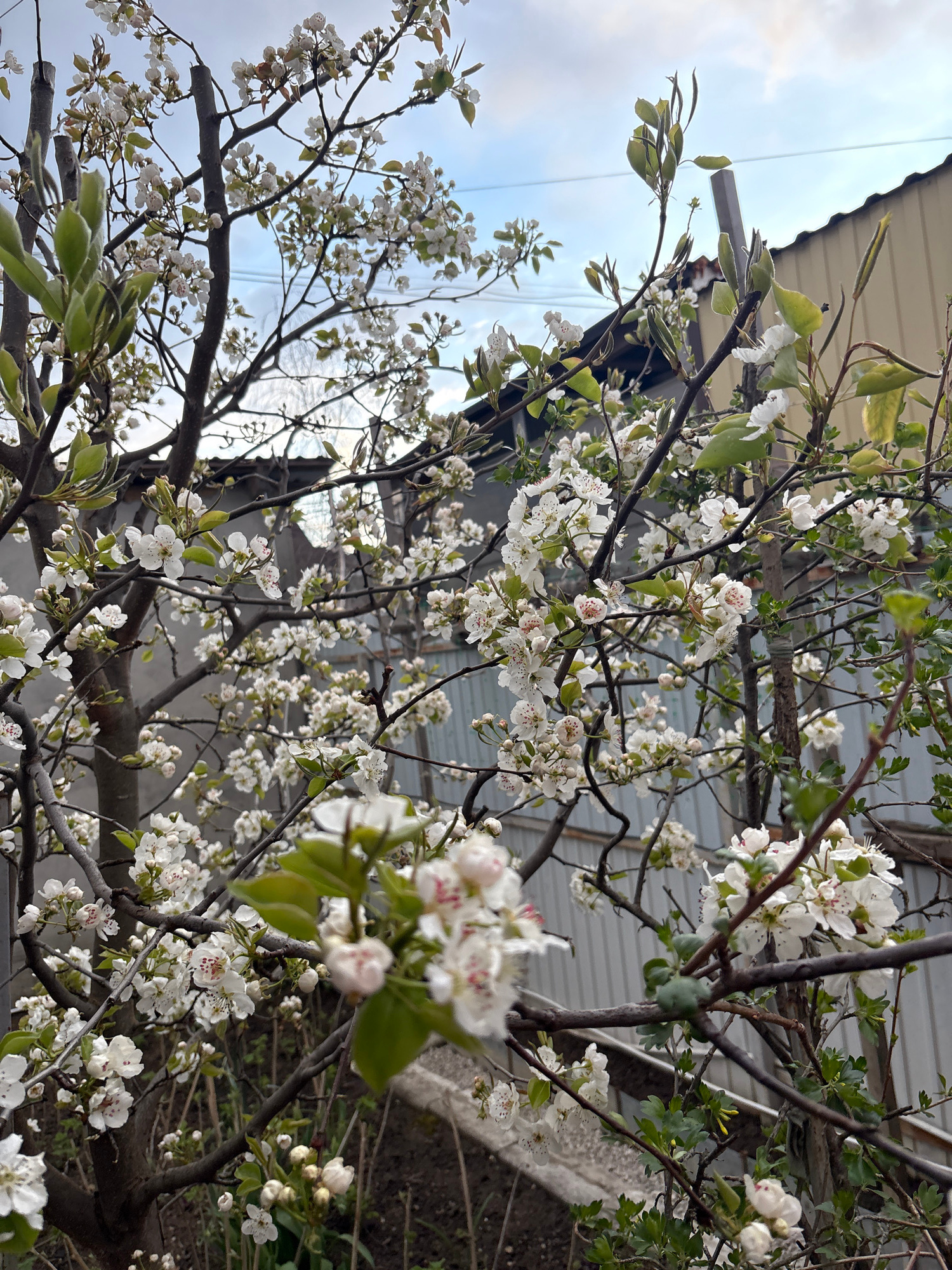 The image depicts a tree in full bloom with white flowers, possibly a pear or apple tree, located in what appears to be an urban environment. The presence of the building with the metallic roof and a…read more