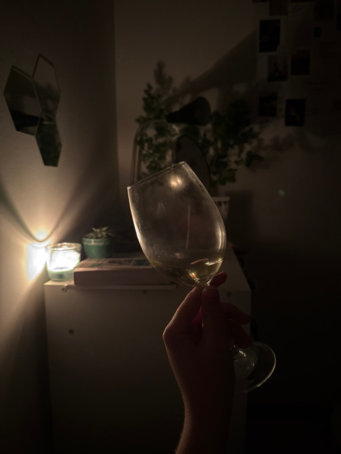 The image depicts an indoor scene in low light, identified as being within the Vozdovac Urban Municipality, Serbia. A human hand, positioned in the lower-center, holds a stemmed wine glass containing…read more