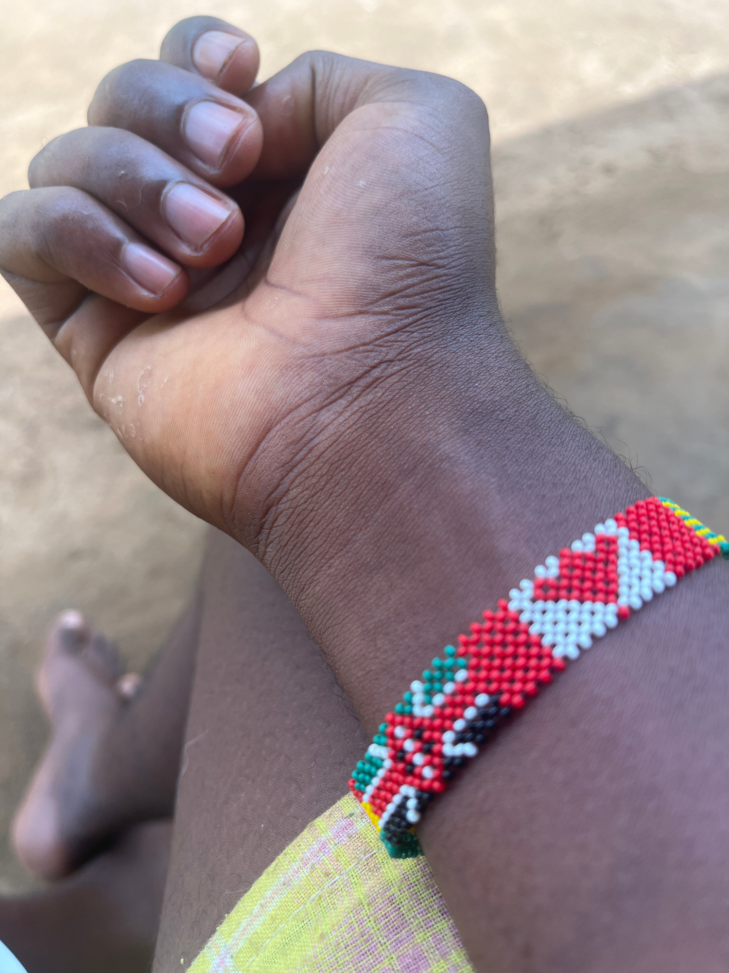 The image shows a person's dark-skinned arm with a tightly clenched fist. A colorful, beaded bracelet adorns the wrist, featuring patterns in red, white, black, and green, bordered by yellow beads. A…read more