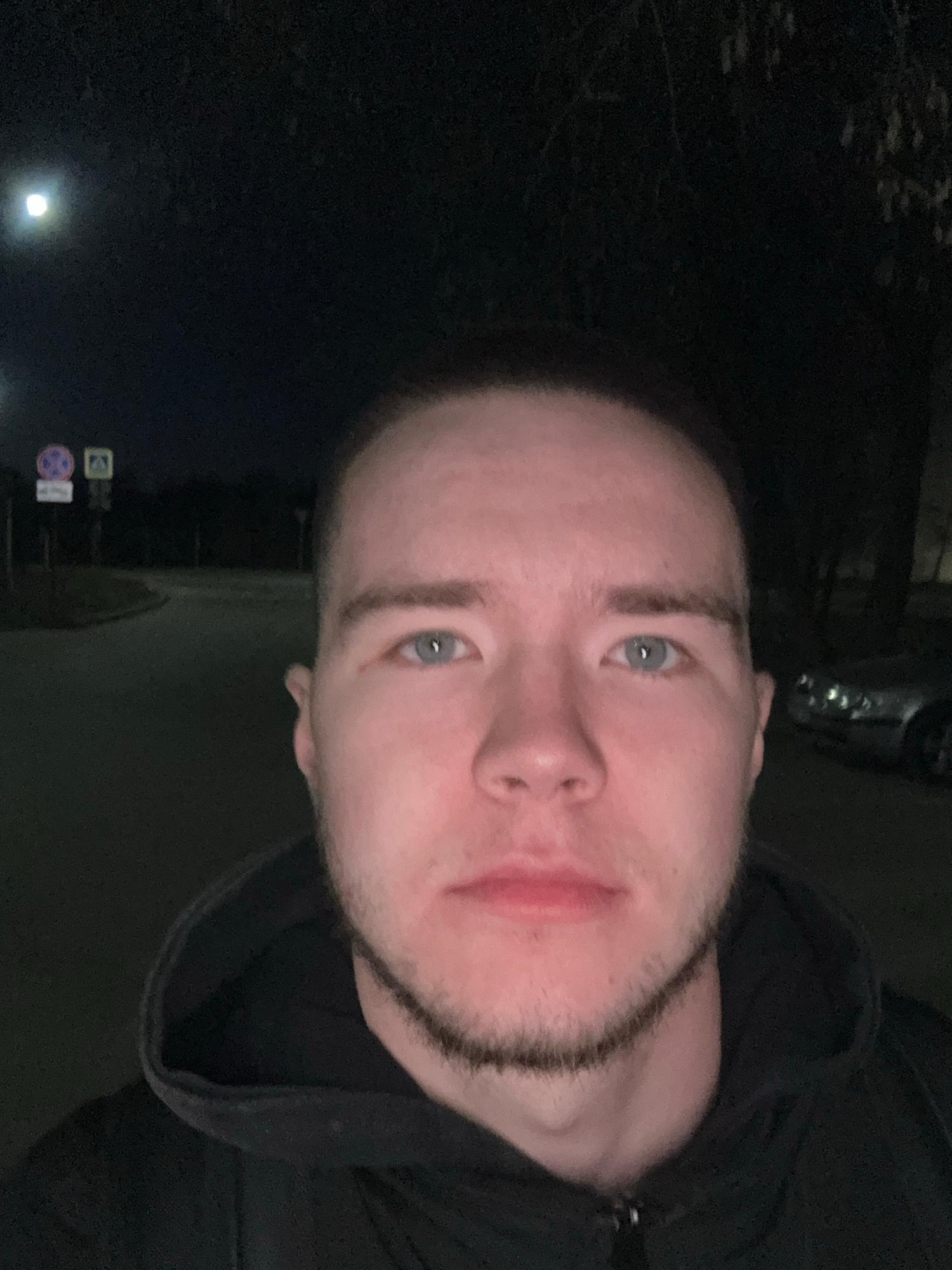 A close-up, vertical portrait captures a young male individual outdoors at night in Kazan, Russia. The subject has fair skin, light blue-grey eyes, dark eyebrows, and a chin strap beard. He is looking…read more