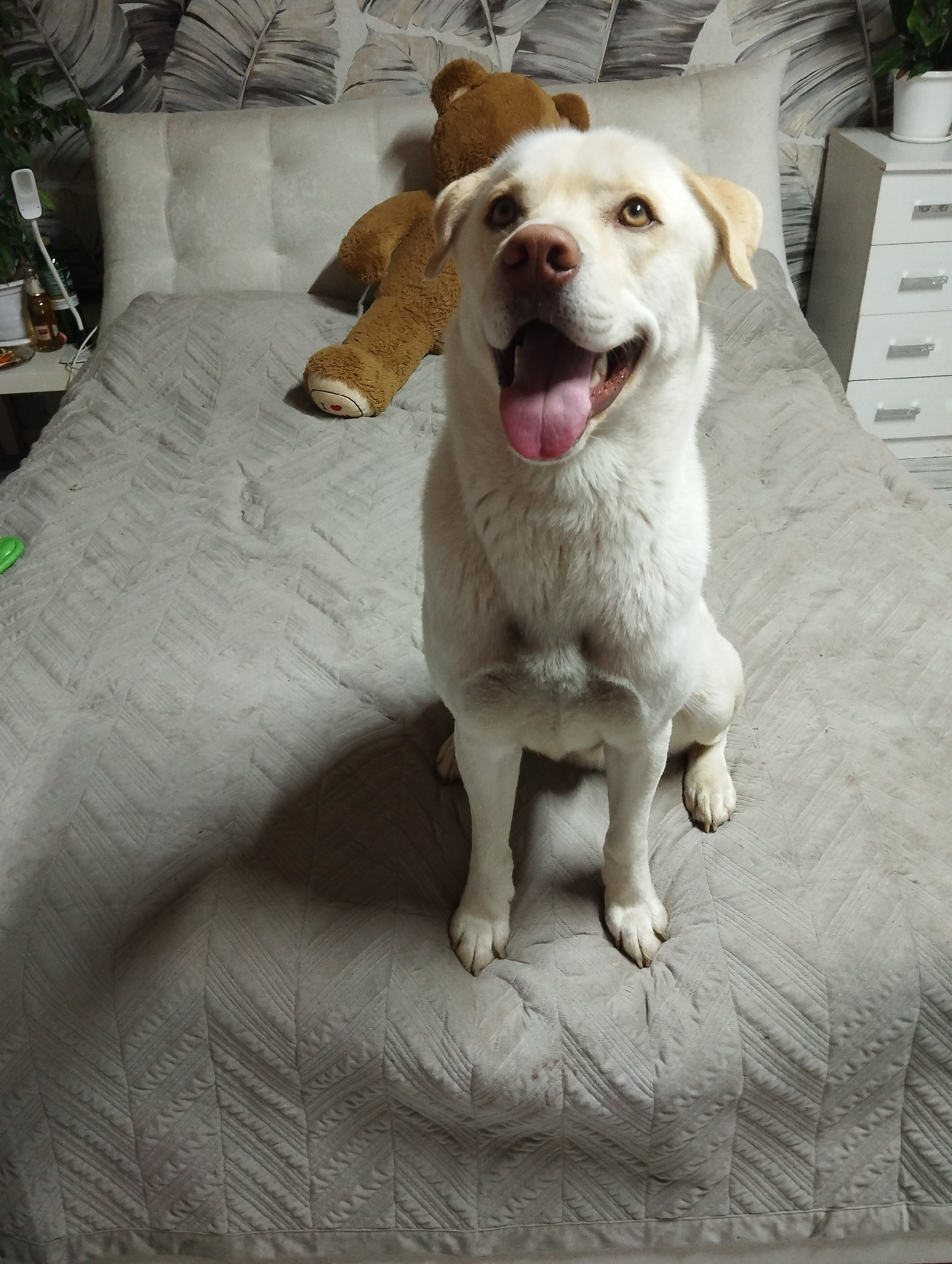 A white Labrador Retriever dog is sitting on a bed with a gray chevron patterned quilt. Behind the dog is a large stuffed teddy bear propped against a light gray tufted headboard. To the left is a sma…read more