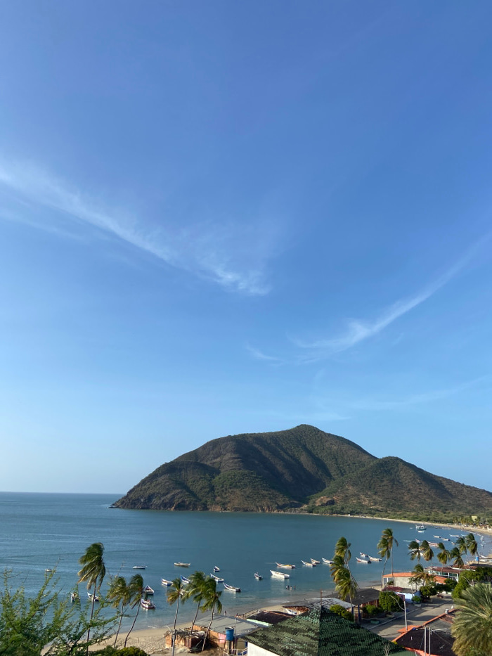The image shows a landscape with a clear blue sky taking up most of the frame. Wispy clouds stretch across the upper left. A large, green mountain rises beside the ocean, creating a natural divide. Th…read more
